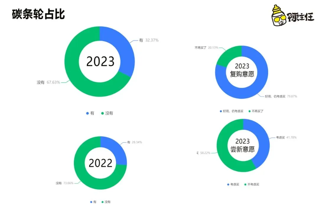 今年有32%受访者拥有碳条轮,相比去年增加6%。有意思的是受访者对于碳条轮的复购意愿和尝新意愿和去年几乎一致,这玩意还是属于“没用过的大多数不想用,用过都说好”的状态。