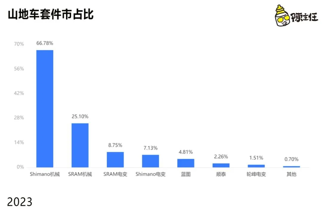 山地套件方面,坊间都有“山地套件看速联”的说法。然鹅市场调查显示:禧玛诺的山地机械套件才是绝对主流,速联引以为豪的山地电变相比禧玛诺山地电变的优势也仅有1.6%。可以预见速联最新的T-Type山地套件并不会让市占比提高多少,毕竟昂贵的顶级山地电变走不起量,还是需要靠技术下放。国产套件厂商会不会通过山地电变弯道超车?(毕竟只需做一个后拨和控制器)拭目以待。