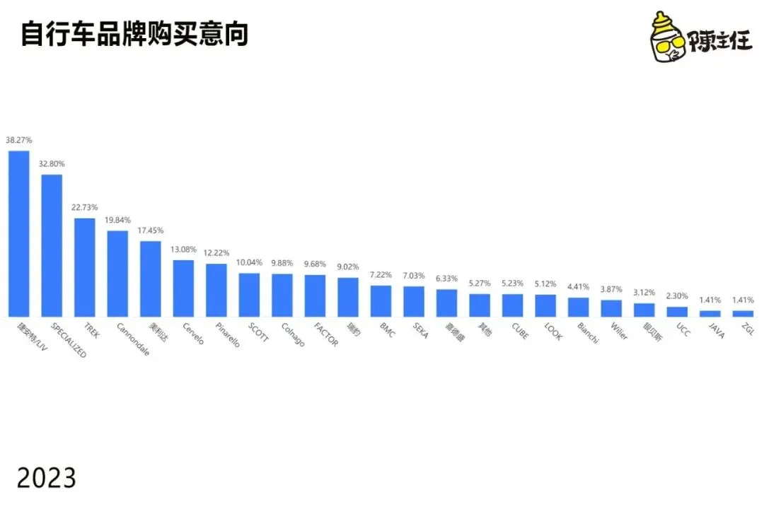 不区分车型的整车品牌购买意向,可以看作是车友的消费升级之选,捷安特依旧高居榜首,美利达被美国三强反超。中国大陆品牌中瑞豹、SEKA和喜德盛的青睐度较高。