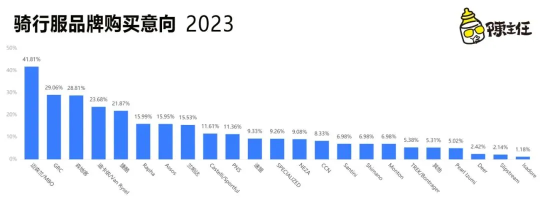 骑行服品牌的购买意向调查,今年迈森兰/MBO取得了较大优势,去年与之持平的GRC和森地客小幅下降到29%左右。迪卡侬和捷酷是另两个得到20%+份额并且跻身前五的品牌;高端国际品牌中,Rapha和Assos青睐度较高,蝎子和PNS也不错。骑行服领域虽卷,但并不是价格决定一切,设计、品质、营销等方面也会起到很大作用。
