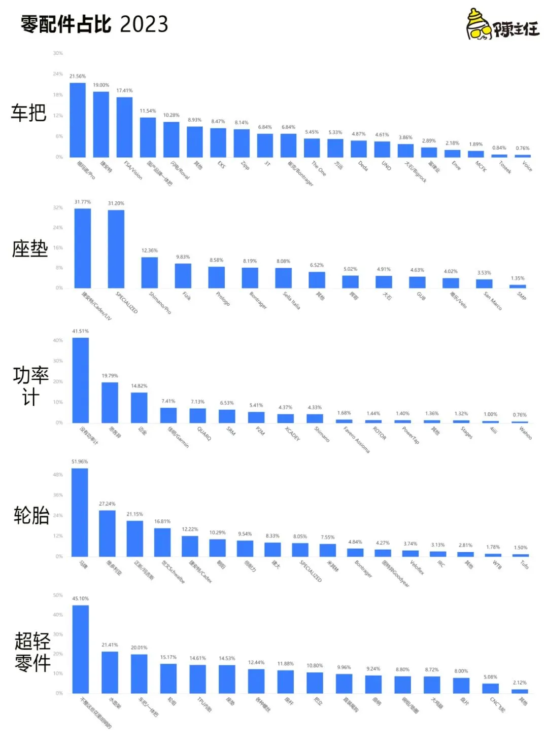 ·座垫方面,前两名的捷安特和闪电基本持平,都在31%左右;而去年的这项调查闪电(40%)相比捷安特和禧玛诺(25%左右)还有较大优势。虽然有不少国产品牌在做碳座垫/3D打印座垫,但目前还没有出现一家厂商能撼动国际大牌,各品牌仍需潜心做好研发和人体工学。