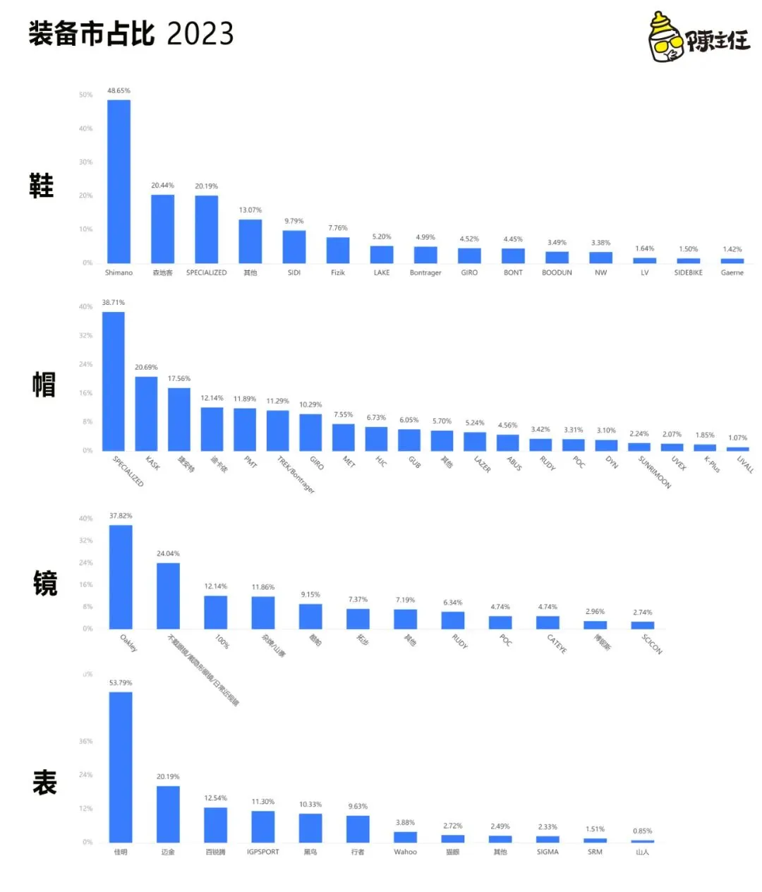 ·头盔方面闪电蝉联冠军,KASK蝉联亚军;去年以14%排第三的Giro今年退步较大。捷安特和迪卡侬从去年的第四和第七升至今年的第三第四,PMT则反超崔克来到第五。