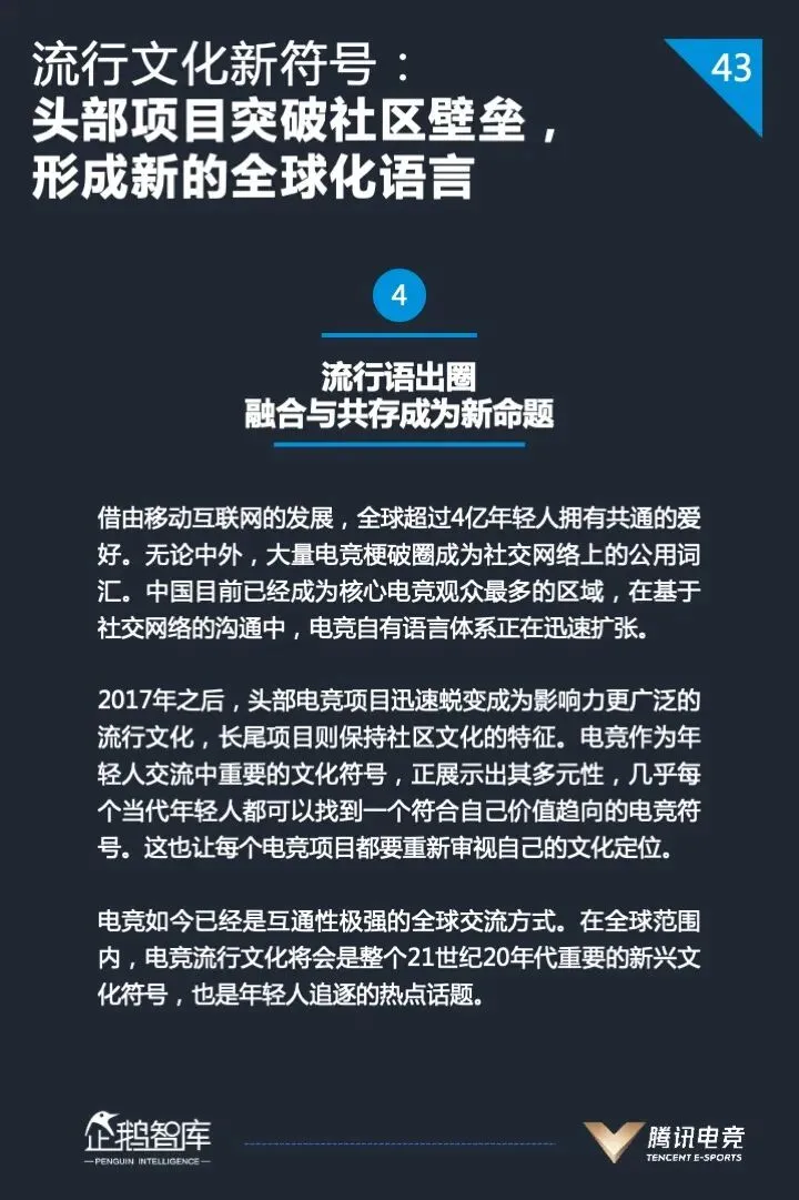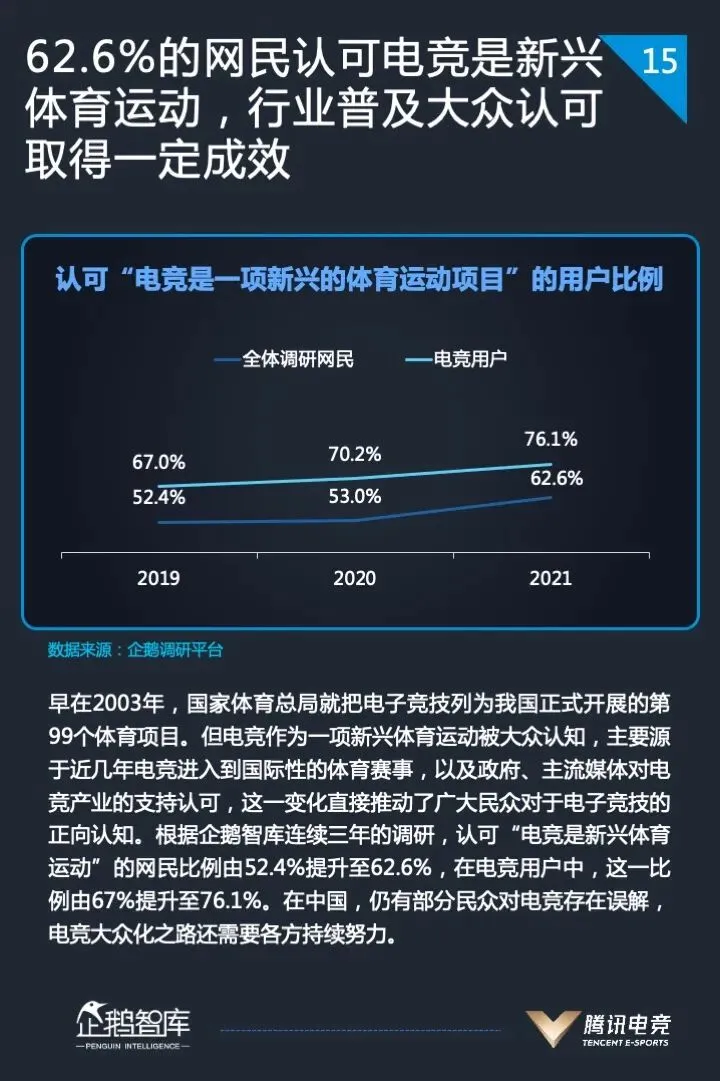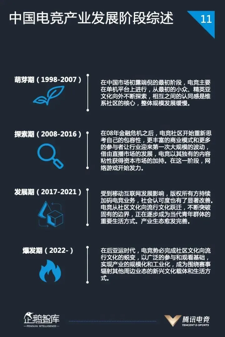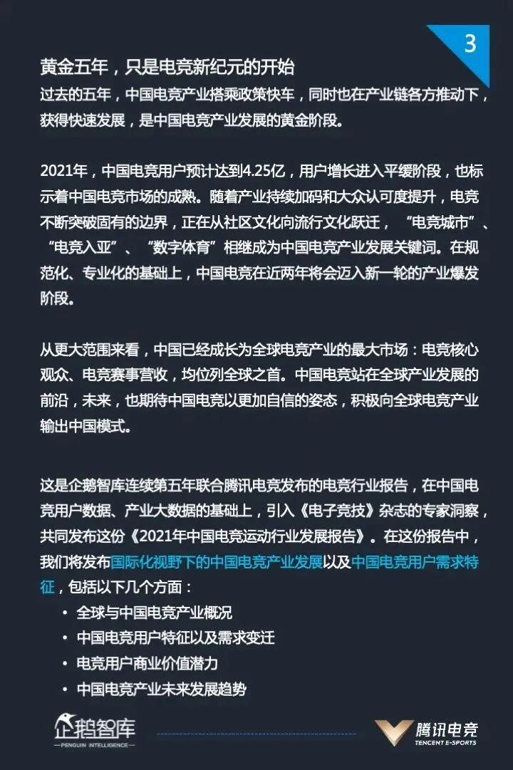 此次腾讯电竞联合企鹅智库发布的电竞行业报告,在中国电竞用户数据、产业大数据的基础上,引入《电子竞技》杂志的专家洞察,共同发布这份《2021年中国电竞运动行业发展报告》。在这份报告中,我们将发布国际化视野下的中国电竞产业发展以及中国电竞用户需求特征,包括以下几个方面: