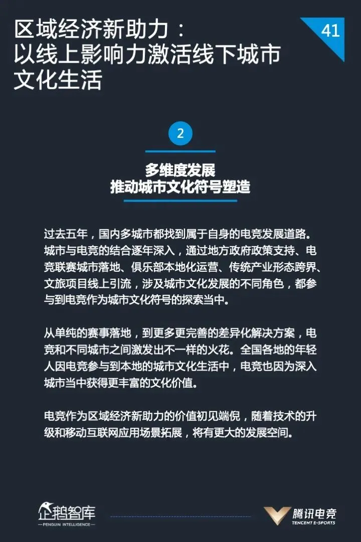腾讯电竞,成立于2016年12月9日,与游戏、文学、影业、动漫、音乐共同组成“新文创”内容文化生态。作为中国最具竞争力的电竞品牌,腾讯电竞业务从2010年以TGA开始布局,经过多年的摸索和积累,电竞已经成为具备巨大商业价值和文化影响力的新兴产业。在属于中国电竞的最好时刻里,腾讯电竞希望与所有行业伙伴一起,抓住时代赋予的机遇,通过“电竞运动城市发展计划”的全面推进,实现电竞让城市更美好,城市让电竞更坚实,共创中国电竞的黄金时代。