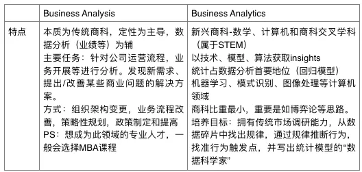 总结起来就是,BA在数学方面以统计为主,主要学习如何建立和评估多变量统计模型;在计算机方面则要求并没有像CS那么高,主要是统计编程(数据库和SQL, R和Python,机器学习);而商科的知识主要是培养business sense。在这里还要为大家解释一点较为常见的误区,就是会把 Business Analysis和 Business Analytics分不清楚,其实很简单,Business Analysis和Business Analytics最大的区别就在于前者是传统商科的范畴,而后者是交叉学科的范畴,通过这张表的总结会更加清晰:一个靠谱的BA课程 首先应该有一些商科的内容,比如金融,运营等; 然后进入重头戏数据处理技术,从Data mining到Visualization再到Forecasting和Machine Learning,搭配统计学,运筹学甚至计量; 接着从各个商业职能入手,细看BA在市场,物流,人力,网络等各方面的应用; 最后学以致用,与企业合作Capstone Project收尾。BA的就业方向主要是当数据分析师和程序设计师。在不同行业中专门从事行业数据搜集,整理,分析,并依据数据做出行业研究,评估和预测。虽然这是一个较新的专业,但却有很好的就业前景。在大数据时代,很多行业都需要擅长挖掘和分析数据的人,例如:IT,互联网,游戏,通信,金融,医药,咨询,零售等,因此BA的毕业生都比较抢手,而且薪酬水平也较高。