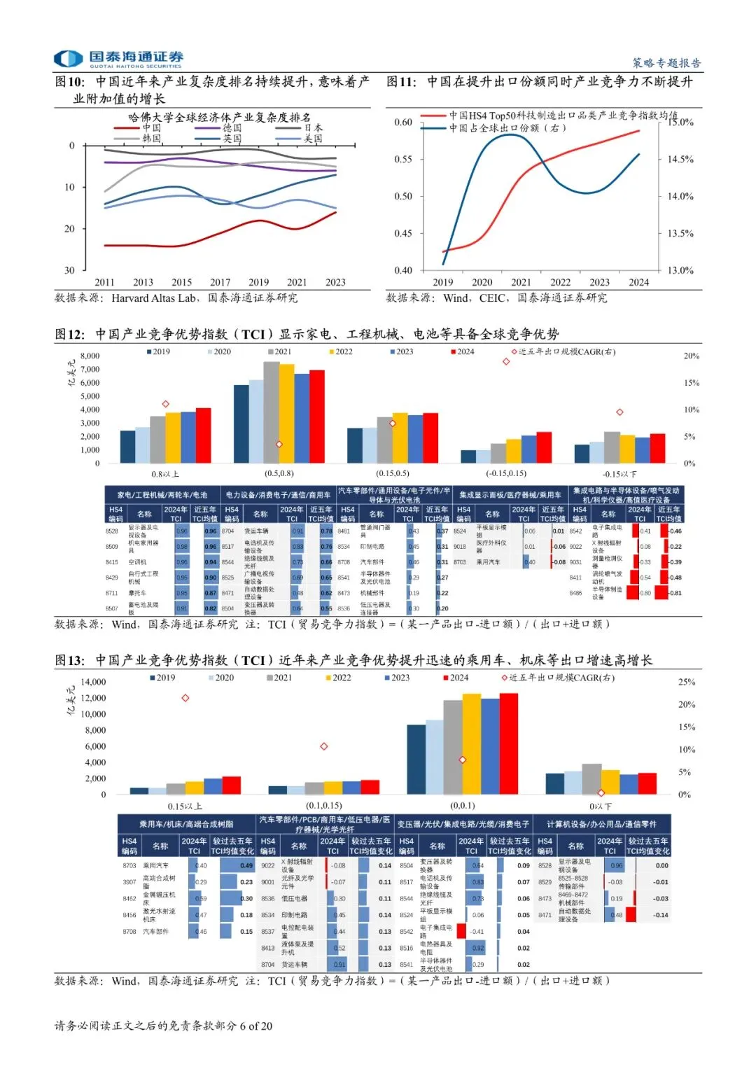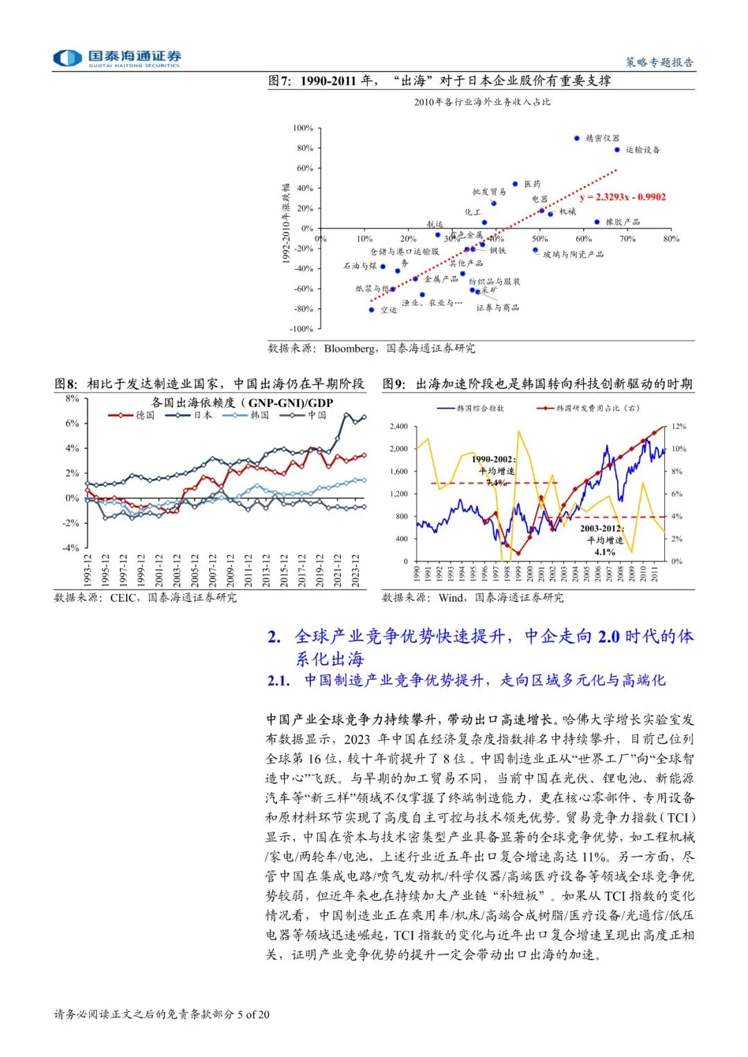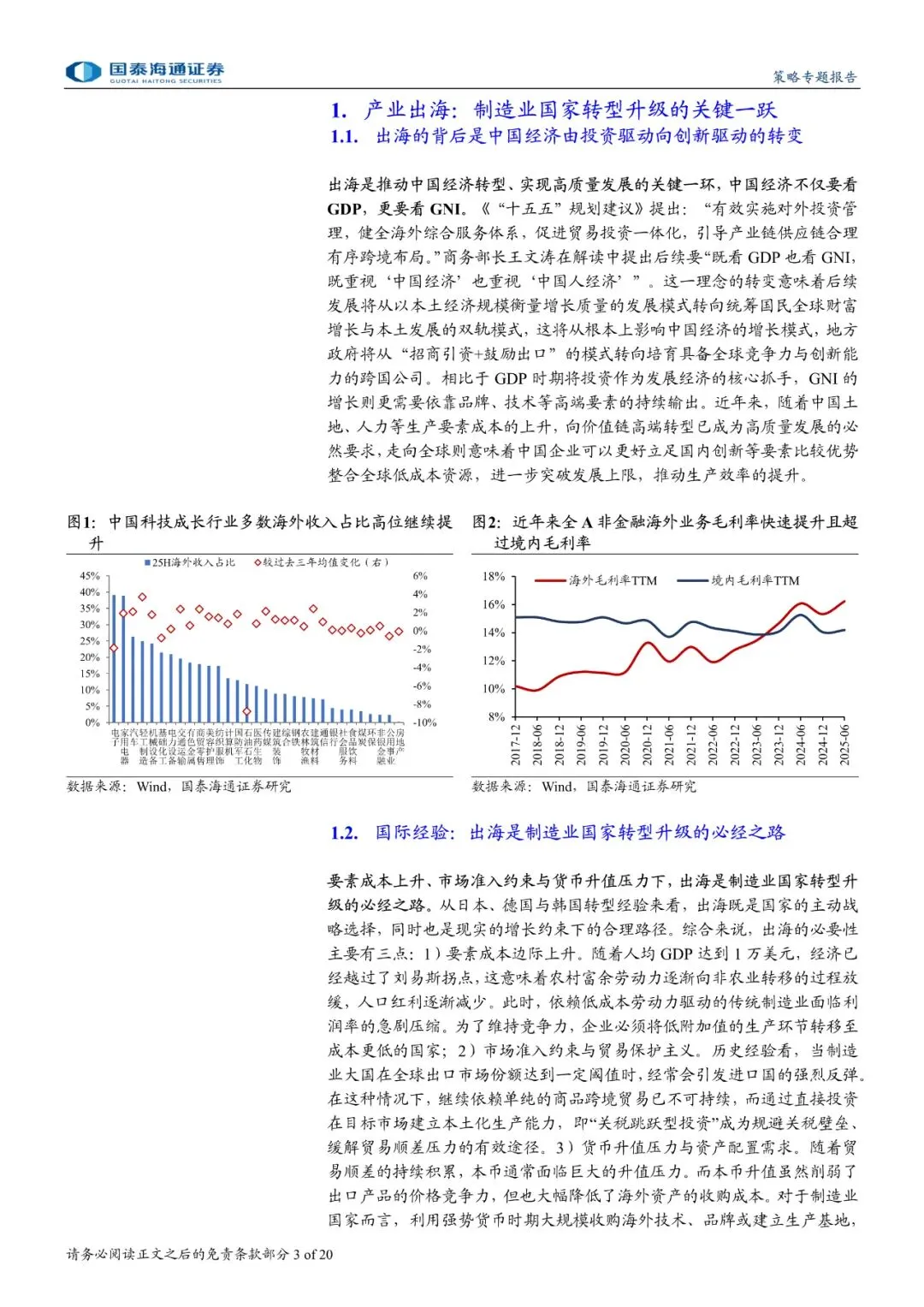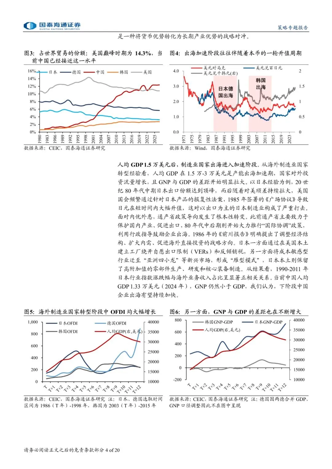 海外制造业大国通常在人均 GDP 约 1.5 万美元后进入近十年的出海加速期,同时伴随着本币的新一轮升值周期。我们认为,走向全球的中国企业可以更好立足国内创新等要素比较优势整合全球低成本资源,并一定程度减少贸易摩擦与改善国际经贸关系。在“既看 GDP也看 GNI”的增长目标下,中国经济发展模式正从“GDP 目标-投资驱动-扩大出口”向“GNI 目标-创新驱动-出海加速”加快转变。