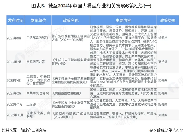 我国大力支持大模型的发展,当前,我国针对性发布有关大模型发展的政策数量相对较少,且主要集中在2023年发布,更多是从人工智能技术以及算力设备等角度支持行业发展。具体如下表所示: