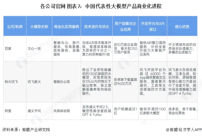 当前,中国的大模型在商业化进程中表现出显著的活力和创新。百度的文心一言在智能办公、旅行服务、电商直播、政务服务和金融服务等多个领域实现应用,技术迭代迅速,用户规模庞大;讯飞星火在智能办公上优势明显,2024年4月,公司推出了业界性能最优的130亿参数的大模型,在效果损失仅3%以内的情况下,输出效率、语义理解准确率等均得到提升,在讯飞星火大模型的飞速发展下,讯飞自有的硬件产品也受到消费市场的关注,搭载讯飞星火的讯飞智能办公本、讯飞听见、讯飞智能录音笔以及讯飞AI学习机等销量不断攀升;阿里巴巴的通义千问以其开源策略和高性能,在中文大模型领域占据一席之地,推动了低成本、易于部署的商业化解决方案。整体来看,中国的大模型市场正通过技术创新、行业合作和安全合规等多维度努力,加速推动AI技术的商业化落地和产业智能化转型。