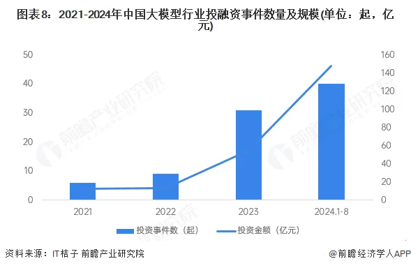 根据IT桔子数据,2021-2024年我国大模型行业投融资金额规模及事件数量逐年增长。2023年我国大模型行业共发生31起投资事件,投资金额合计达54.84亿元。2024年截至8月19日,我国大模型行业已发生投融资事件40起,共计147.56亿元。