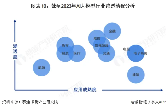从应用领域渗透率情况来看,截至2023年,金融、政府、影视游戏和教育领域是大模型渗透率最高的四大行业,渗透率均超过50%。电信、电子商务和建筑领域的应用成熟度较高。