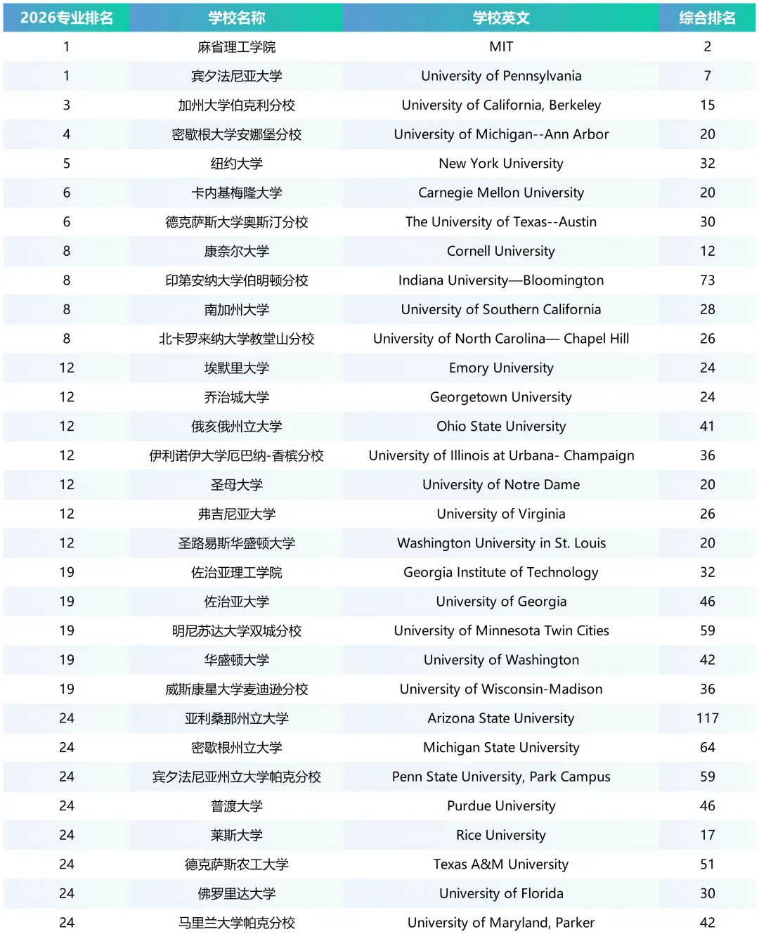 2026年USNews美本商科专业排名