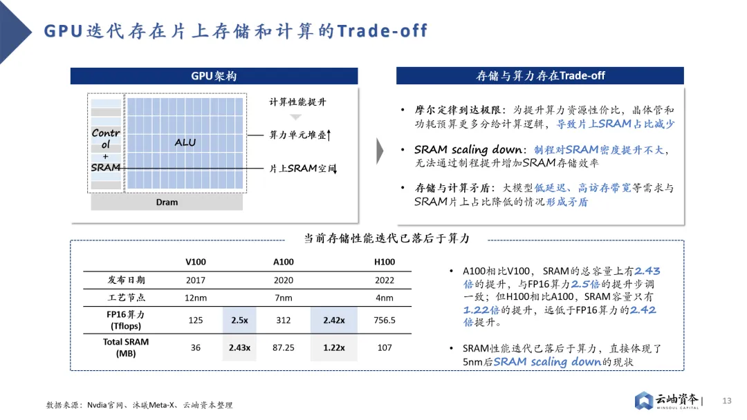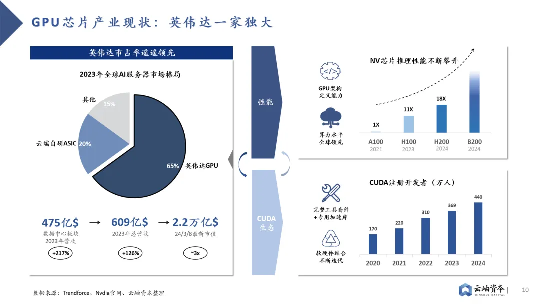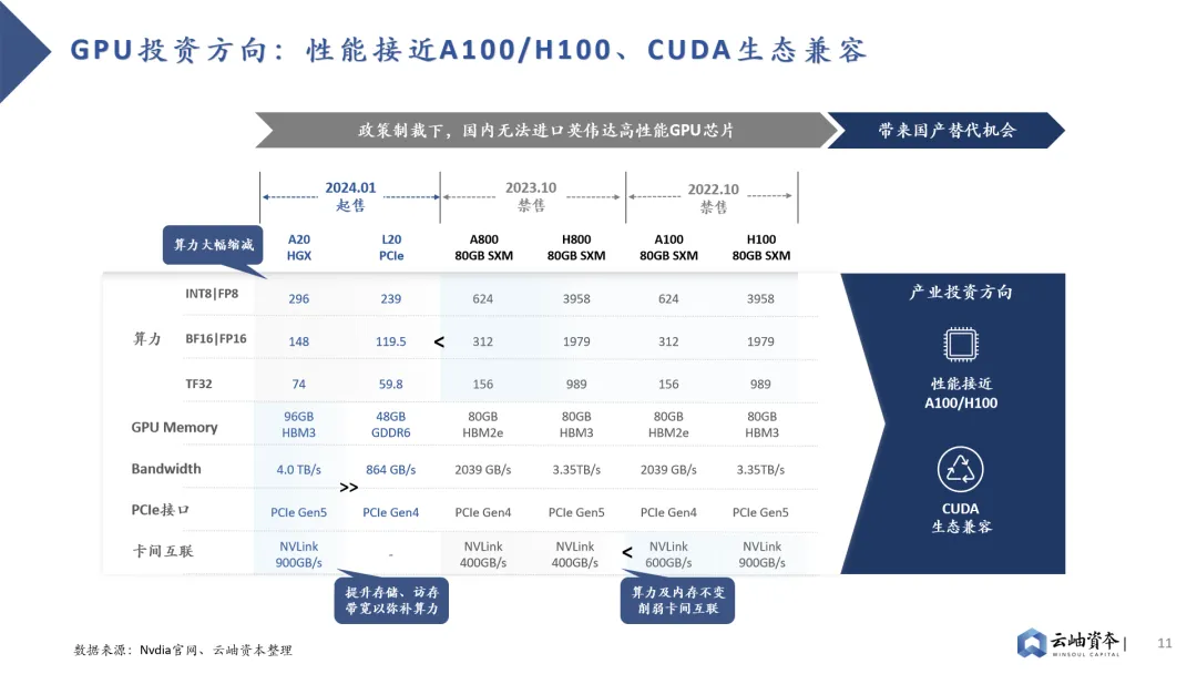 从CNN发展至Transfomer,大模型仍在持续升级中,对AI芯片通用性提出更高要求。硬件端是否能持续兼容各类大模型的迭代升级成为重要标准,GPU架构将成为未来主流架构。相较性能更为优异的DSA架构,GPU架构在通用性上的突出优势使其能快速兼容各类模型、场景,通过大规模落地量产平摊研发成本。此外,GPU架构于性能端也存在软件优化空间,CUDA平台已形成软件生态壁垒,助力AI各类场景应用硬件加速。GPU芯片英伟达一家独大,高性能硬件+CUDA生态强强绑定,软硬件结合构建行业壁垒。2023年英伟达在全球AI服务器市场占有率达到65%,在全球GPU芯片领域更是保持绝对的龙头地位,市占率达到80%以上。2023年英伟达数据中心板块营收达475亿美金,同比增长217%,最新市值已达到2.2万亿美金。英伟达稳固的龙头地位来自于软硬件结合形成的生态壁垒,硬件层面算力水平全球领先的同时搭配软件平台CUDA,为客户带来1+1>2的大模型训推成效。2022年10月,美国商务部工业与安全局(BIS)公布了《对向中国出口的先进计算和半导体制造物项实施新的出口管制》,禁售了英伟达的高性能H100、A100芯片。为了应对政策制裁,英伟达推出了中国特供版H800、A800芯片,在单卡算力不变的基础上削弱了卡间互联能力,阻碍多机多卡算力集群的构建。2023年10月美国商务部宣布禁令升级,特供版H800、A800芯片成为历史,英伟达只好再次推出性能更低的A20、L20芯片,算力遭到大幅削减。在英伟达高性能芯片获取困难的背景下,国内高性能GPU芯片预计将长期处于供不应求阶段,因此我们认为国产GPU应首先解决有无问题,国产替代的投资机会预计将集中于硬件性能接近A100/H100,软件兼容CUDA生态的GPU芯片创业公司。存储成为GPU性能瓶颈