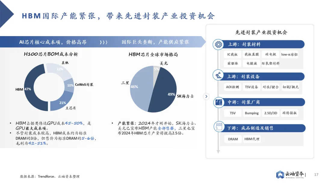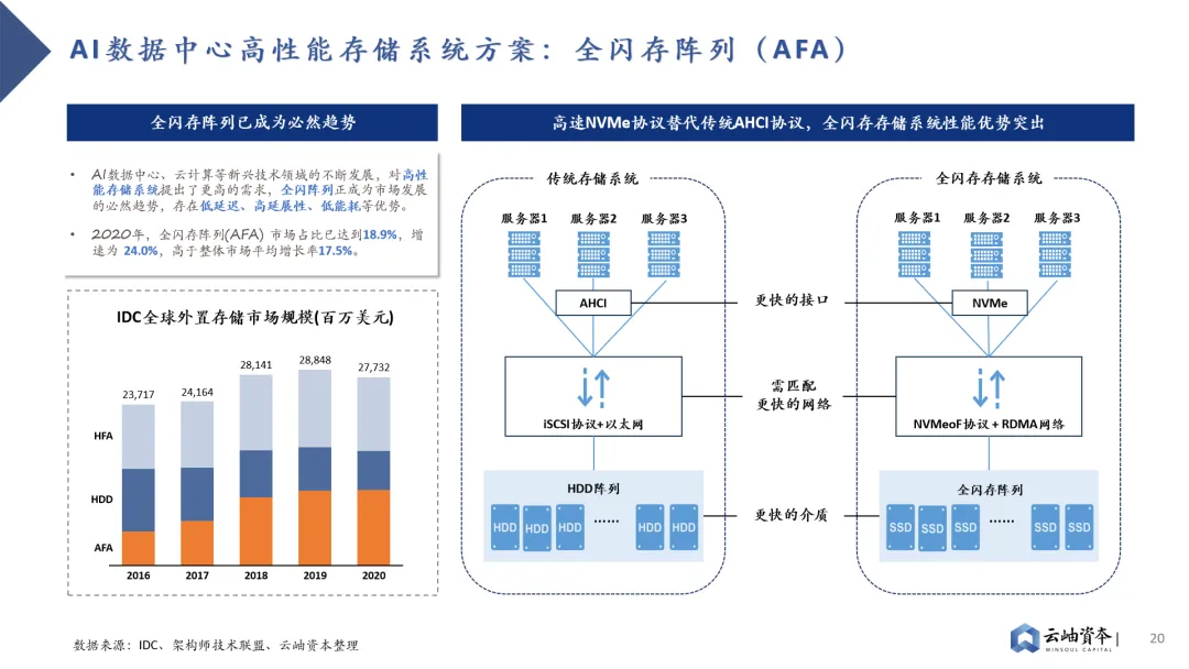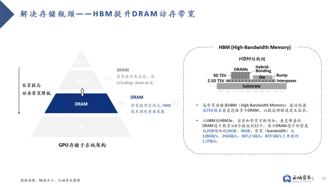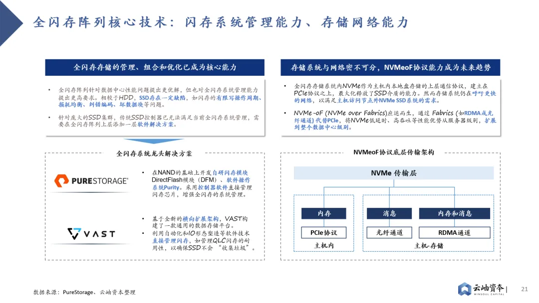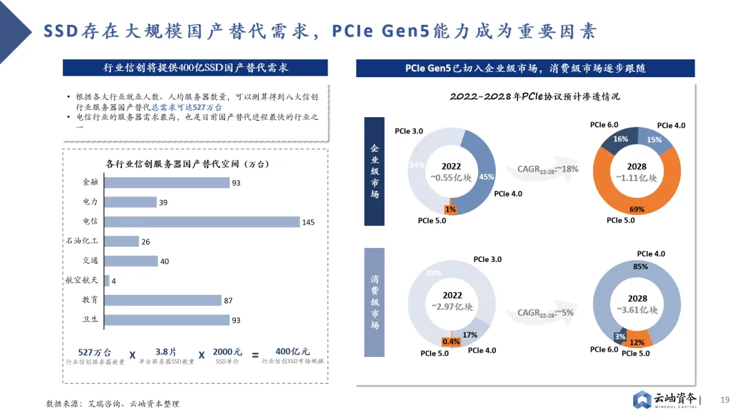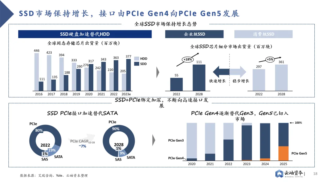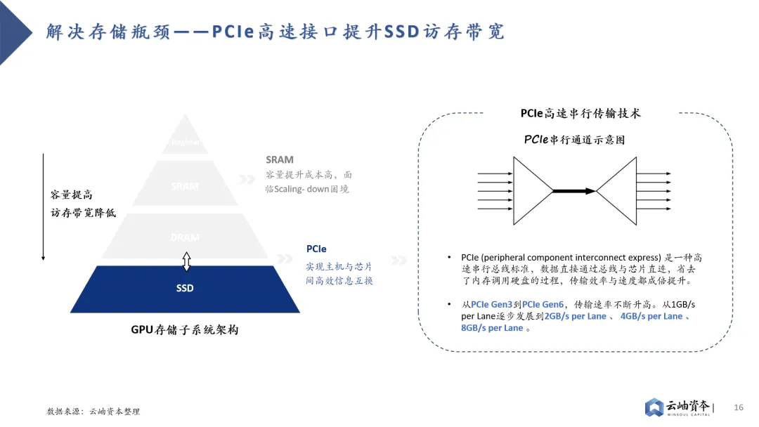 GPU迭代存在存储与计算的Trade-off,存储性能迭代已落后于算力迭代。GPU架构存在算力单元“小”而“多”的特点,在摩尔定律接近极限的情况下,为提升算力资源性价比,业界主要通过增加算力单元堆叠的方式提升计算性能;而在存储方面,片上存储空间被挤压的同时,SRAM密度却无法通过制程提升进行弥补,导致当前存储性能迭代已落后于算力。H100相对于A100在FP16算力水平上有2.42倍的提升,而SRAM存储容量提升仅有1.22倍。存储子系统容量、带宽不足已成为GPU发展瓶颈。大模型训推需要对海量数据进行存储、处理,这对GPU存储系统容量、访存带宽提出了更高的要求。对于GPU架构而言,算力单元堆叠不是难事,当前计算任务主要耗时集中于等待数据从存储系统到达计算单元的过程,而非计算单元进行矩阵计算的过程。GPU主要采用多级Cache的分布式存储子系统,离计算单元越近的存储单元容量越小,访存带宽越高,因此性能提升方向有三:提高SRAM容量、提高DRAM带宽、提高SSD带宽。其中片上SRAM容量提升成本高,并非主流路径。因此,业界主要采取两种路线解决存储瓶颈。其一是HBM(High Bandwidth Memory)技术,HBM技术解决了当前DRAM容量不足、带宽低的问题,已成为主流算力芯片“标配”。其通过硅通孔TSV技术垂直连接多个DRAM,缩短互联距离以提高传输带宽及容量。从HBM初代技术到目前最新的HBM3e,垂直堆叠的DRAM芯片数量从4个提高到12个,每个DRAM芯片的密度从2GB增加到24GB、36GB,带宽从128GB/s、256GB/s、307.2 GB/s、819 GB/s上升到约1.2TB/s。其二则是PCIe技术的持续升级。目前SSD接口已从SATA逐步转向更高速的PCIe接口,这是一种高速串行总线标准,数据直接通过总线与芯片直连,省去了内存调用硬盘的过程,传输效率与速度都成倍提升。从PCIe Gen3到PCIe Gen6,传输速率不断升高,从1GB/s per Lane逐步发展到2GB/s per Lane 、 4GB/s per Lane 、 8GB/s per Lane 。三大巨头垄断背景下HBM成本高昂、产能紧张,带来国内先进封装产业链投资机会。HBM芯片占据AI芯片近半数成本,售价为标准DRAM芯片的5-6倍,毛利高达42%-51%。同时受制于国际三大巨头SK、三星、美光垄断格局,HBM产能紧张,预定周期已达6-12月。先进封装作为HBM制造中附加值最高的环节,发展潜力巨大,存在国产产业链投资机会。全球SSD市场保持增长态势,传输带宽不断增加,PCIe Gen4已逐步转向PCIe Gen5。2022年全球SSD出货量为3.63亿块,保持增长态势的同时加速替代HDD。细分市场中企业级SSD市场仍处于快速增长通道,2022年出货量为0.55亿块,2022-2028年CAGR达18%。消费级SSD市场追随企业级市场脚步保持稳步增长,2022年出货量为2.97亿块,2022-2028年CAGR达5%。高速串行接口PCIe与SSD绑定加深,逐渐替代SATA成为主流接口,并不断向更高速协议发展。PCIe Gen4已替代PCIe Gen 3成为主流接口,PCIe Gen5已切入市场,成为未来发展趋势。此外,信创市场将提供400亿元SSD国产替代需求,PCIe Gen5能力成为重要考量因素。金融、电信、教育等八大行业存在信创服务器国产替代需求,总需求可达527万台。以单台服务器SSD数量3.8片、SSD单价2000元计算,行业信创将带来400亿元SSD市场规模。其中电信行业服务器需求最高,也是国产替代进程最快的行业之一,对于SSD高容量、高带宽存在高要求。目前PCIe Gen5已加速切入企业级SSD市场,预计2028年渗透率将达69%。消费级市场也将追随企业级市场步伐,预计2028年PCIe Gen5渗透率达12%。全闪存阵列性能优势突出,已成为高性能数据中心的必然趋势。AI数据中心、云计算等新兴技术领域的不断发展,对高性能存储系统提出了更高的需求。随着SDD替代HDD的进程,SDD低延迟、高吞吐与传统SCSI协议低吞吐、高延迟形成矛盾,这就出现了NVMe高速协议。NVMe高速协议缩短和优化了数据路径,加快了服务器内、服务器与存储阵列间的信息传输,配合SSD高速介质,突显了全闪存阵列的性能优势。2020年,全闪存阵列(AFA)市场占比已达到18.9%,增速为24.0%,高于整体市场平均增长率17.5%。全闪存阵列方案提出两大核心技术要求:系统管理能力及NVMeoF网络能力。1)相较于HDD,SSD存在闪存的有限写操作周期、损耗均衡、纠错编码、坏数据块等问题,传统SSD控制器已无法满足全闪存系统管理需求,如何进行全闪存存储的管理、组合、优化成为核心技术要求,国际龙头PureStorage、VAST Data均通过自研软件技术方案以增强全闪存系统管理。2)主机内本地盘存储通信以NVMe协议作为上层协议,建立在PCIe协议之上,最大化释放了SSD介质的能力。然而存储系统仍在呼吁更快的网络,以满足主机访问节点外NVMe SSD系统的需求,NVMe-oF (NVMe over Fabrics)应运而生。NVMe-oF通过Fabrics (如RDMA或光纤通道)代替PCle,将NVMe低延时、高吞吐等性能优势从服务器级别,扩展到整个数据中心级别。半导体:佰维存储|赛昉科技|芯旺微电子|爱芯科技|忆恒创源|芯华章|芯河半导体|匠岭半导体|昕原半导体|思朗科技|行芯|天易合芯|开元通信 | 超摩科技 | 芯砺智能 | 伴芯科技 | 长飞先进半导体