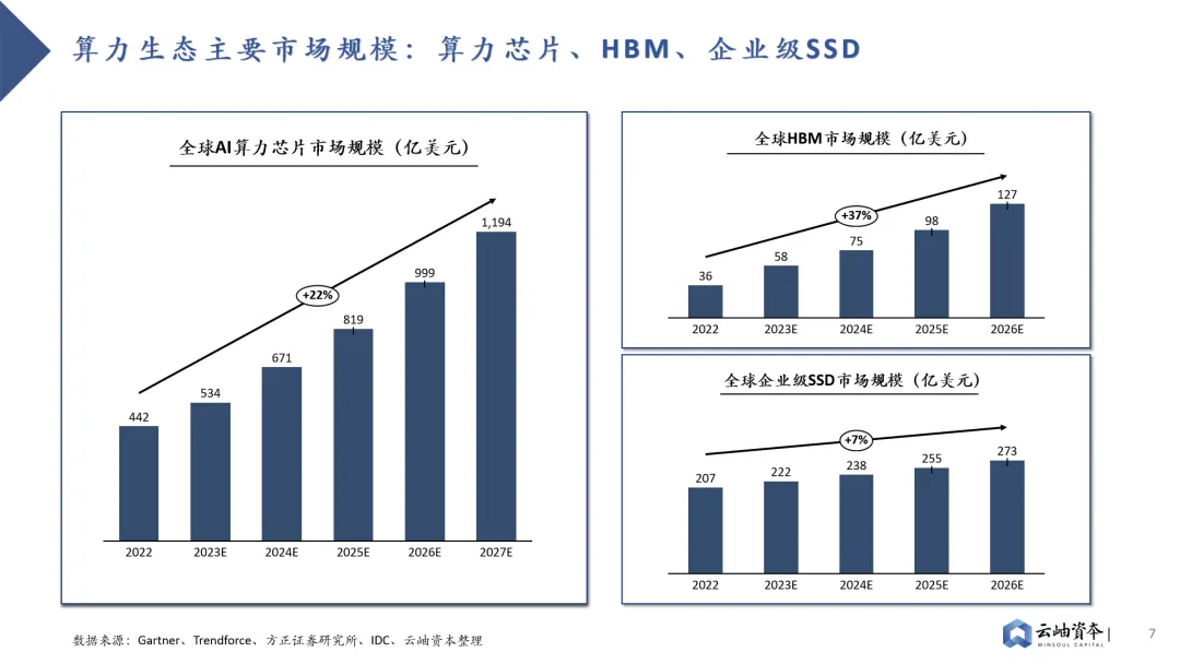 AI大模型的发展经历了萌芽期、探索沉淀期和迅猛发展期三个阶段。在萌芽阶段,浅层机器学习向深度学习转化,孕育出重要的CNN和RNN模型。2017年,Transformer的问世奠定了如今主流大模型的算法架构基础,预训练大模型开始登上历史舞台。随着Google发布BERT模型、OpenAI发布GPT模型,AI大模型彻底进入井喷时代,全球科技公司不断探索大模型的能力边界。近年来,伴随着各个大模型的涌现,模型运算量的增长速度已经将摩尔定律远远甩在身后。目前,大模型正在往多模态、拓宽上下文长度等方向深层次发展,这对模型的参数量和训练数据量提出了更高要求。数据量的持续攀升催生了对于算力的强需求,同时,如何进行大规模数据的高效处理和存储是当前算力设施面临的两大挑战。因此,算、存、网三大板块核心芯片共同构成算力生态,未来将持续受益于算力的旺盛需求。其中,算力芯片最为紧缺,目前仍以GPU为主,CUDA生态在短期内难以被突破。存储则日渐成为大模型训推的瓶颈,HBM、高速PCIe等新技术快速渗透和迭代,持续提高计算效率。传输上,高性能的网络通信芯片能够提升数据传输的效率,降低延迟,有效提升客户集群训练能力。算力生态市场前景广阔,规模持续增长。据Gartner预测,到2027年,全球AI算力芯片市场规模预计将达到1194亿美元,2022年至2027年复合增长率达22%。全球HBM市场规模增长迅速,2026年市场规模预计将达127亿美元,2022年至2026年复合增长率达37%。全球企业级SSD市场规模稳步增长,预计将从2022年的207亿美元增长至2026年的273亿美元。GPU成为AI算力芯片主流架构