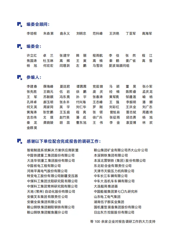 报告编委会顾问成员包括中国企业改革与发展研究会副会长、中国一重集团有限公司原党委书记、董事长刘明忠,国家制造强国建设战略咨询委员会委员、国家智能制造专家咨询委员会荣誉主任朱森第,中国工程院院士李培根,中国社会科学院工业经济研究所书记曲永义,中国电子技术标准化研究院信息安全研究中心副主任范科峰,爱波瑞集团董事长、中国制造业国际论坛创始人王洪艳,中国中车集团运营管理部副部长丁亚军,中国航空工业集团机载集团原副总经理高海军等。