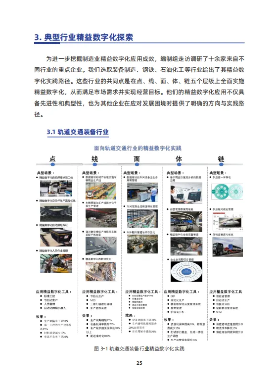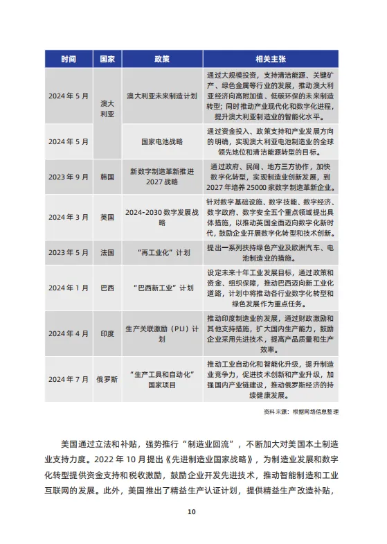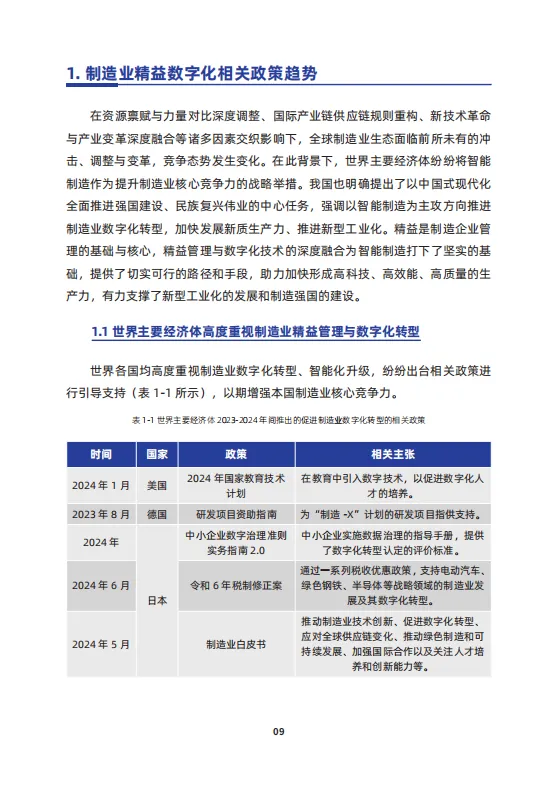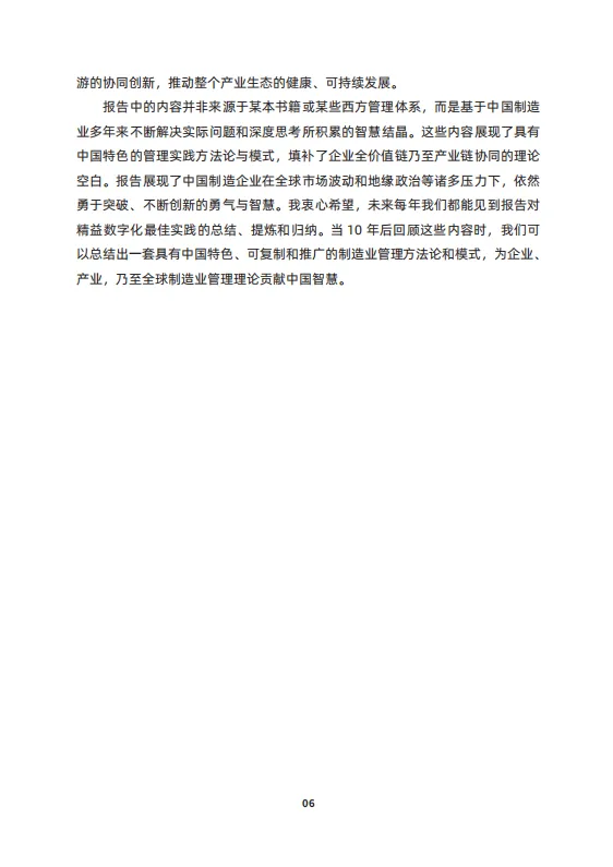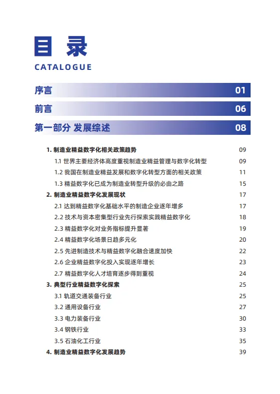 报告对比了美国、德国、日本、韩国、英国、法国、澳大利亚等世界主要经济体对于工业发展的政策,并分析了国家发展改革委、工业和信息化部、交通运输部多部门与各城市关于发展制造业的政策措施,同时对上百家制造业企业展开调研,总结并归纳出近年来中国制造业实施精益数字化的现状、亮点、趋势与挑战,并集中展示典型企业的精益数字化成功案例,旨在从产业链的研发、供应链、运营生产方式转型、装备升级等方面推进价值创造、数字化转型,智能化升级,助力企业实现高端化、绿色制造的高质量发展。