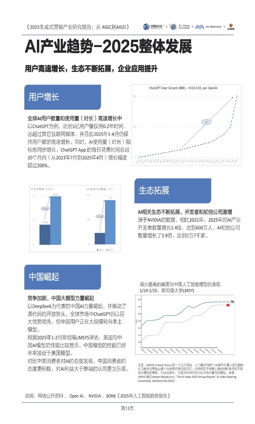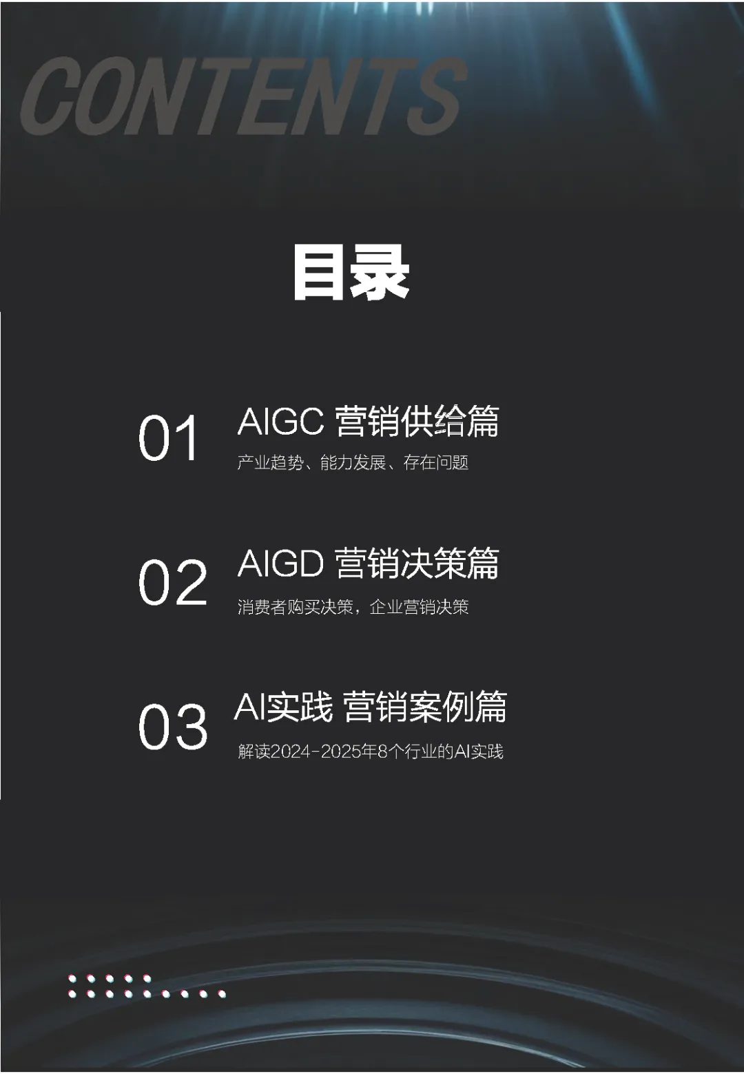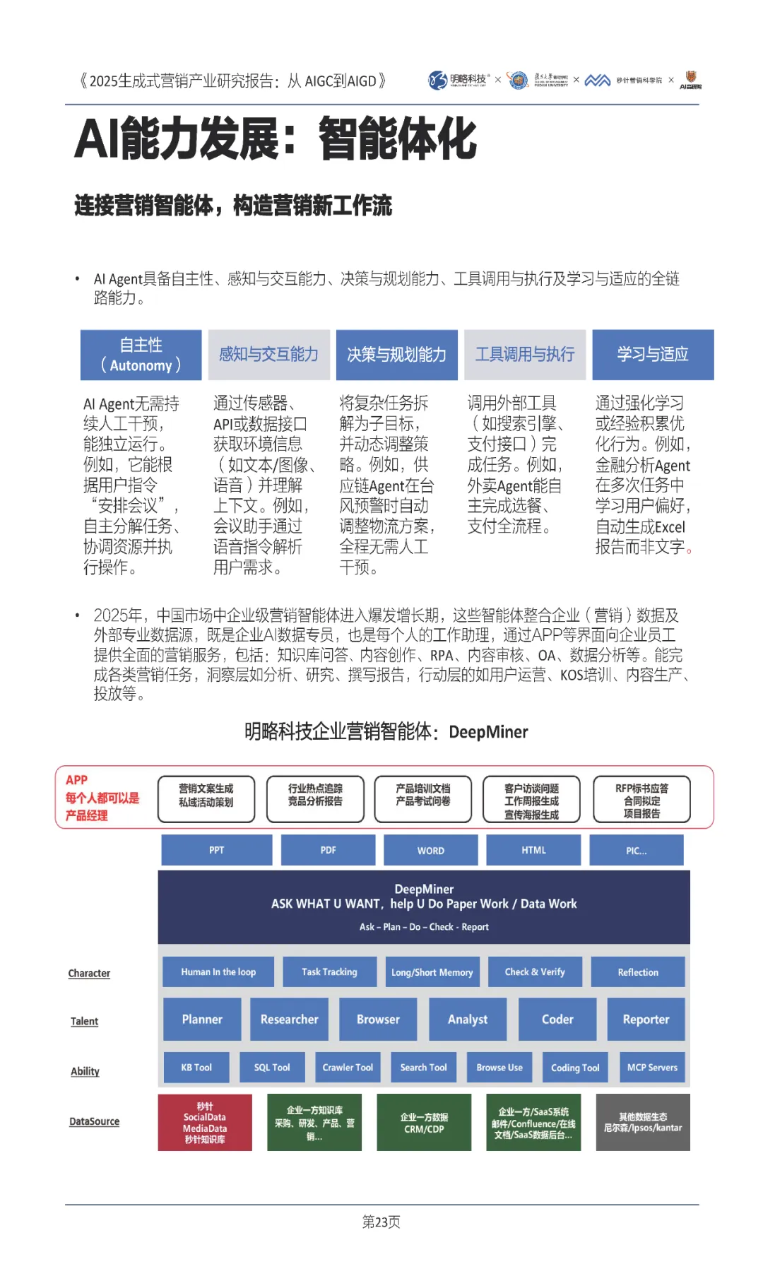 在数字化浪潮的推动下,人工智能(AI)技术正以前所未有的速度重塑营销产业。2025年,生成式AI(AIGC)已从技术探索阶段迈向规模化落地,不仅极大提升了营销效率,更在决策层面展现出巨大潜力。《2025年生成式营销产业研究报告》由明略科技、复旦大学管理学院及秒针营销科学院联合出品,深入剖析了AIGC在营销领域的最新趋势、能力发展、存在问题及实践案例,为营销人提供了宝贵的战略指南和行动手册。