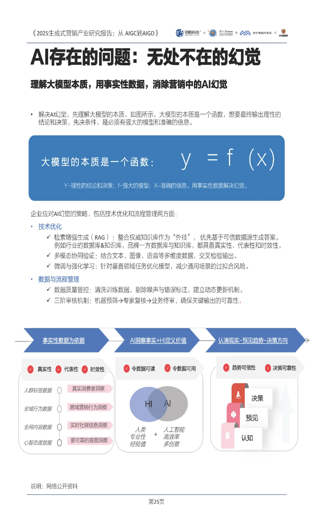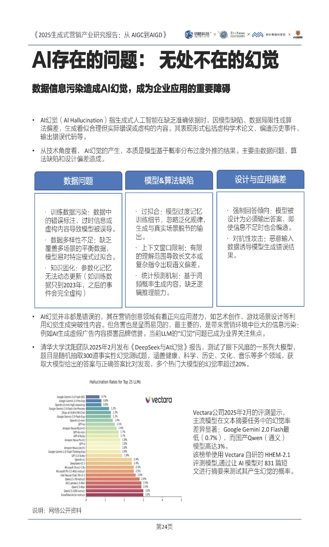 尽管AIGC技术取得了显著进展,但AI幻觉(AI Hallucination)和偏见问题依然不容忽视。报告指出,AI幻觉指AI在缺乏准确依据时生成错误或虚构内容的现象,其产生源于数据问题、算法缺陷和设计偏差。清华大学沈阳团队的研究显示,多个热门大模型的幻觉率超过20%。为解决这一问题,报告建议采用检索增强生成(RAG)、多模态协同验证等技术手段,提升AI输出的准确性和可靠性。同时,针对AI偏见问题,报告呼吁提高对AI偏见的认识,通过技术手段和管理措施减少偏见影响。