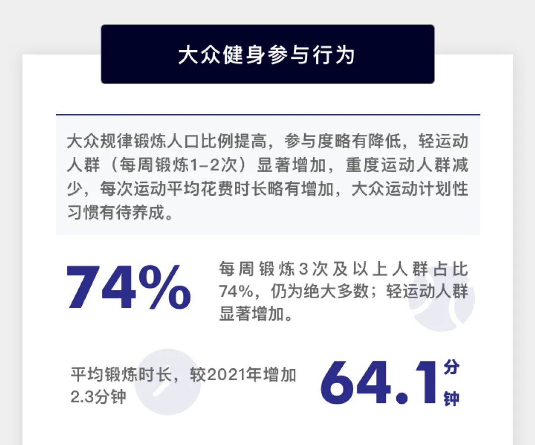 只是对于当局者和入局者而言,认清趋势、把握时机变得尤为重要——而这,也正是《2022年大众健身行为与消费研究报告》存在于此的重要意义所在。