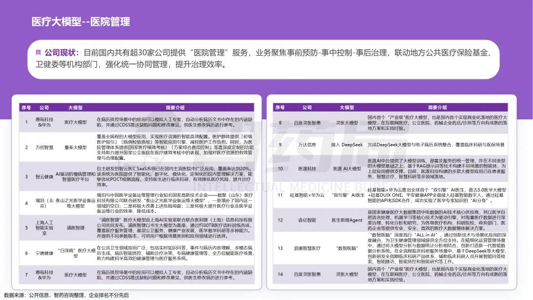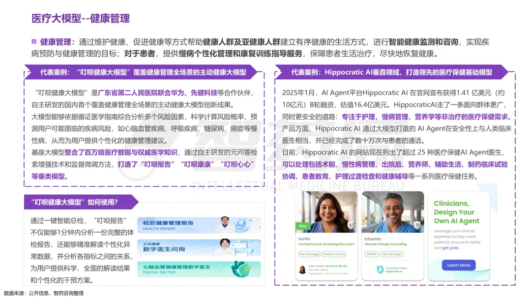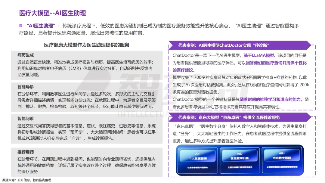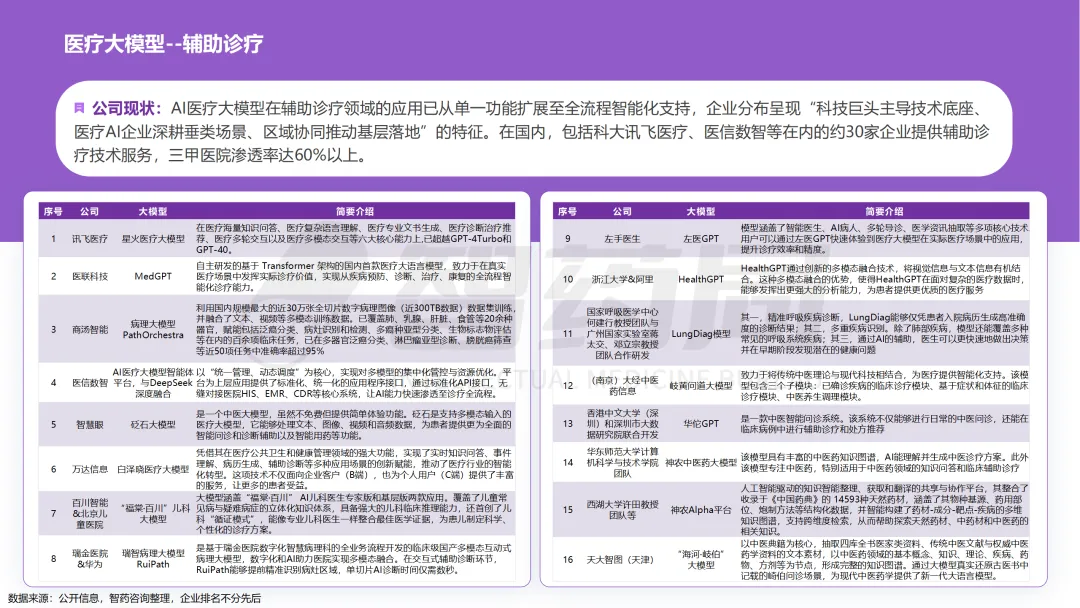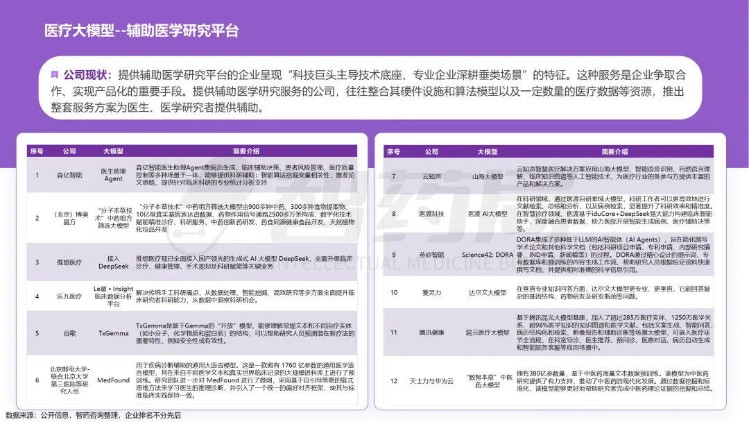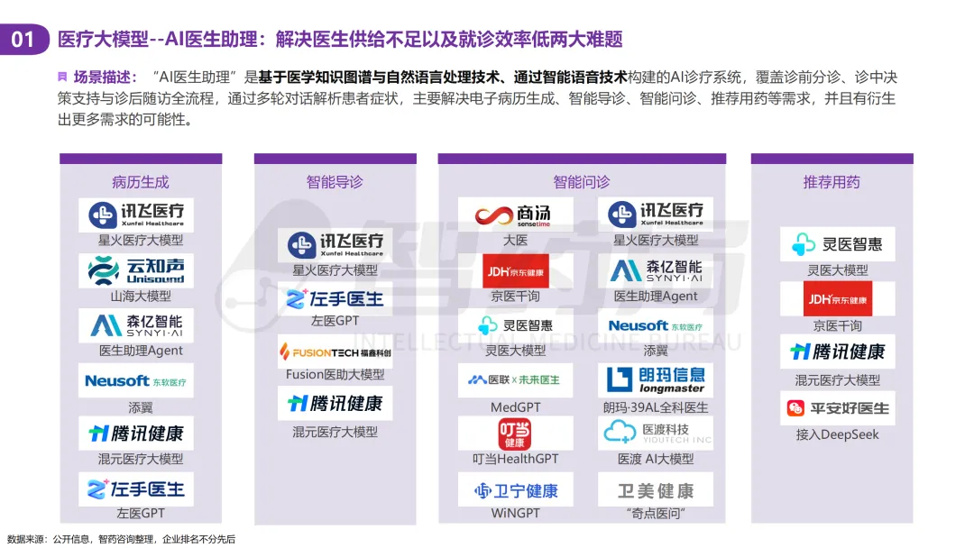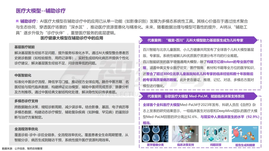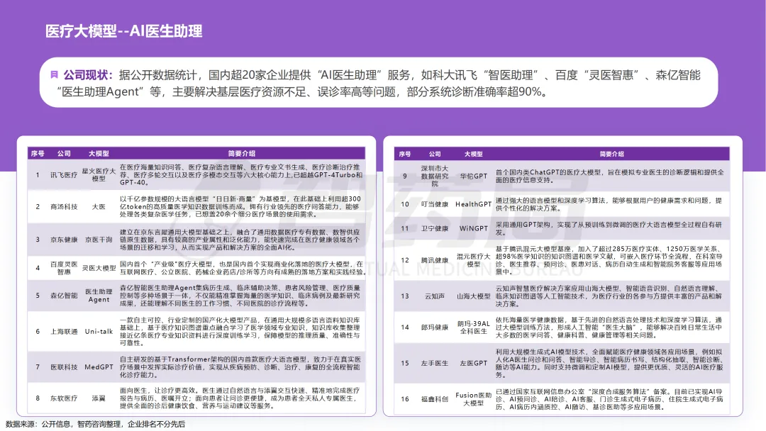 医疗行业凭借其数据密集、知识复杂、需求多元的显著特征,已成为AI技术最具潜力的应用领域之一。随着人工智能技术的突破性发展,大模型在医疗领域的应用正快速从理论探索走向实际落地,全方位重构医疗服务的价值链条,展现出巨大的潜力。当前,AI大模型在医疗领域的应用已覆盖八大核心场景,包括AI医生助理、医学影像分析、辅助诊疗、药物研发、疾病风险预测、健康管理、医院管理和辅助医学研究平台。这一技术浪潮不仅能够缓解医疗资源短缺与服务质量提升之间的矛盾,更催生出智能诊疗助手、生成式药物设计、全生命周期健康管理等创新业态,推动医疗行业向高效化、精准化、普惠化和智能化方向转型升级。近年来,大模型落地医疗已蔚然成风,技术层面,ChatDoctor、Med-PaLM等模型已在临床场景达到接近人类水平;产业层面,谷歌、腾讯、华为等国内外科技巨头加码布局,各个细分赛道更是涌现出一批初创企业;政策层面,国家卫健委等中央部门及北京、上海等地方政府纷纷发布文件,鼓励医疗领域大模型发展。基于此,智药咨询深入地探讨了大模型+医疗行业的产业链图谱、应用场景分析分析、企业进展以及发展趋势等方面,旨在为关注AI医疗领域的投资者、从业者、研究者等提供第三方参考依据。