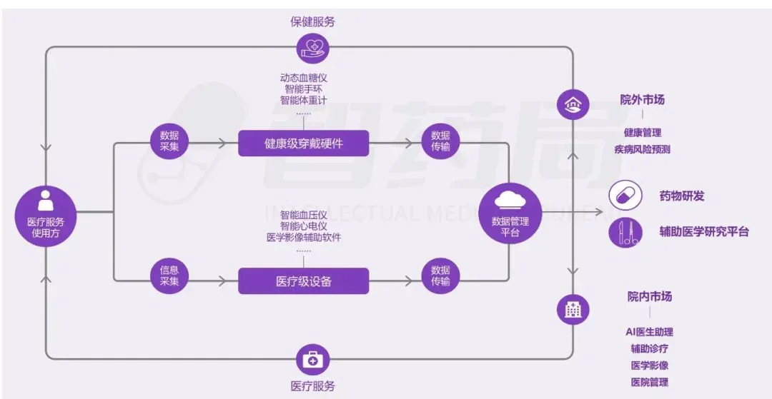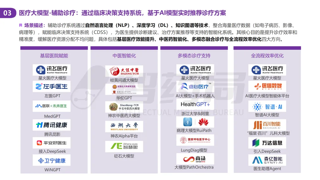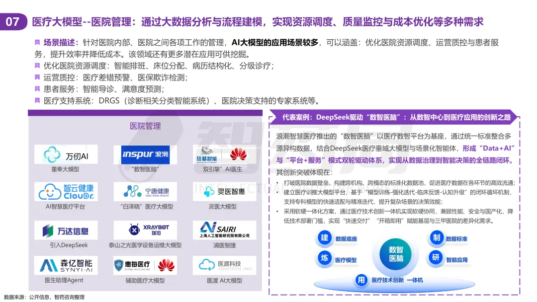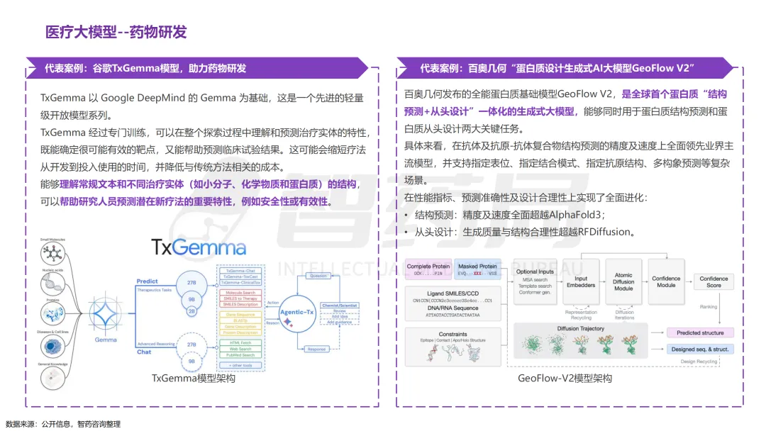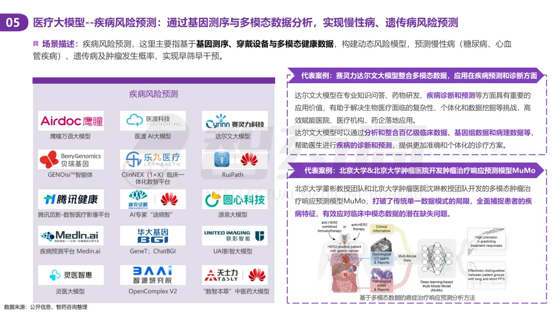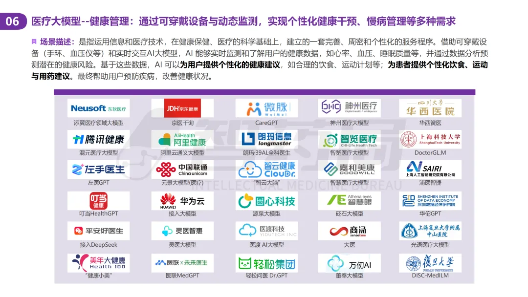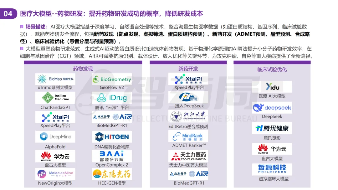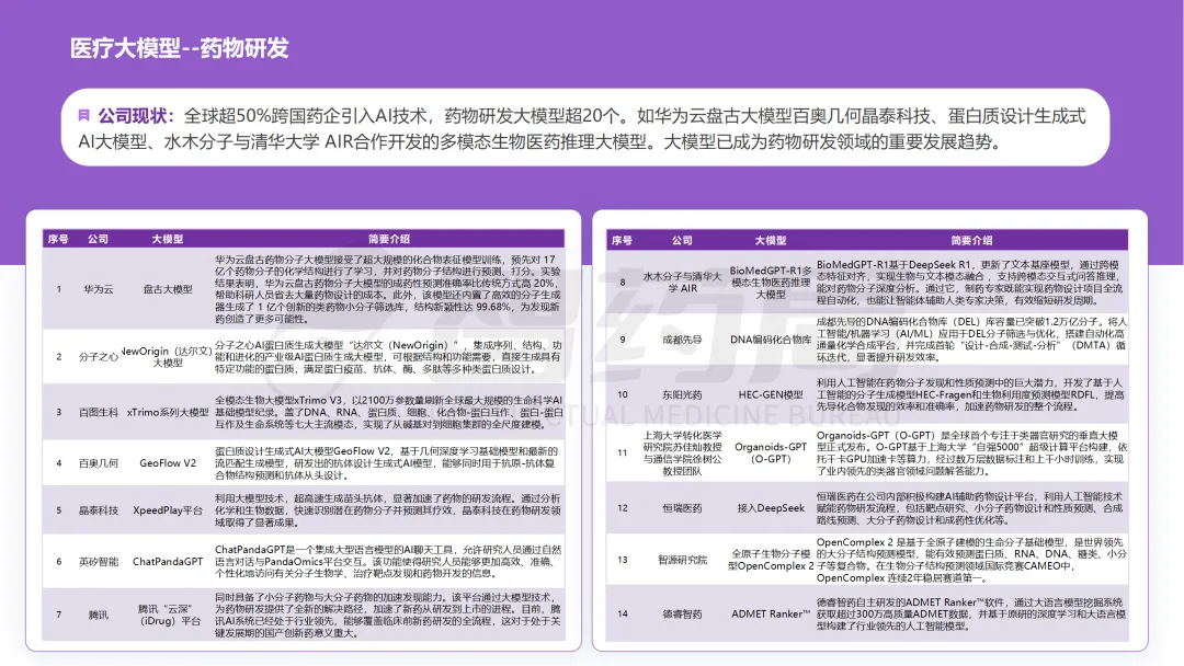 医疗行业凭借其数据密集、知识复杂、需求多元的显著特征,已成为AI技术最具潜力的应用领域之一。随着人工智能技术的突破性发展,大模型在医疗领域的应用正快速从理论探索走向实际落地,全方位重构医疗服务的价值链条,展现出巨大的潜力。当前,AI大模型在医疗领域的应用已覆盖八大核心场景,包括AI医生助理、医学影像分析、辅助诊疗、药物研发、疾病风险预测、健康管理、医院管理和辅助医学研究平台。这一技术浪潮不仅能够缓解医疗资源短缺与服务质量提升之间的矛盾,更催生出智能诊疗助手、生成式药物设计、全生命周期健康管理等创新业态,推动医疗行业向高效化、精准化、普惠化和智能化方向转型升级。近年来,大模型落地医疗已蔚然成风,技术层面,ChatDoctor、Med-PaLM等模型已在临床场景达到接近人类水平;产业层面,谷歌、腾讯、华为等国内外科技巨头加码布局,各个细分赛道更是涌现出一批初创企业;政策层面,国家卫健委等中央部门及北京、上海等地方政府纷纷发布文件,鼓励医疗领域大模型发展。基于此,智药咨询深入地探讨了大模型+医疗行业的产业链图谱、应用场景分析分析、企业进展以及发展趋势等方面,旨在为关注AI医疗领域的投资者、从业者、研究者等提供第三方参考依据。