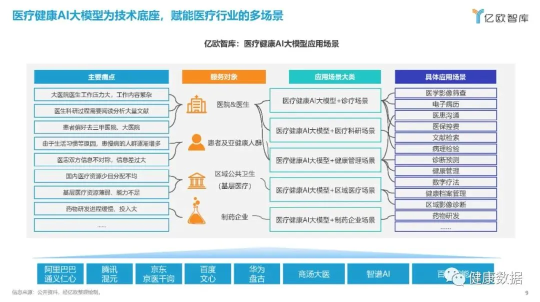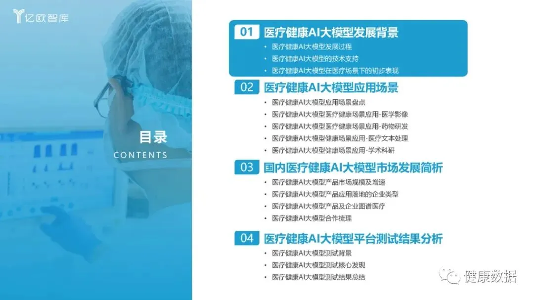 医疗健康AI大模型,作为人工智能的一个分支,能够通过学习大量的数据来生成新的数据实例,这在医疗领域有着广泛的应用前景,如药物研发、医学影像、医疗文本分析等。医疗健康AI大模型为技术底座,赋能医疗行业的多场景,为患者提供差异诊断,为医生提供诊断建议;提升药物研发成功的概率,降低研发成本;能够提供准确、快速、个性化的诊断和建议。本报告,旨在分析当前医疗健康AI大模型在实际应用中的成效,提高医疗各界对医疗健康AI大模型的认识和理解,讨论其对医疗服务可及性和质量的潜在影响,增强医疗各界对新技术的接受度。