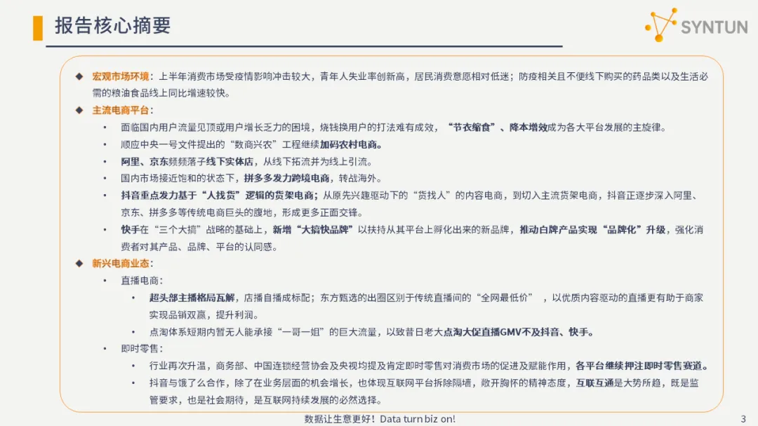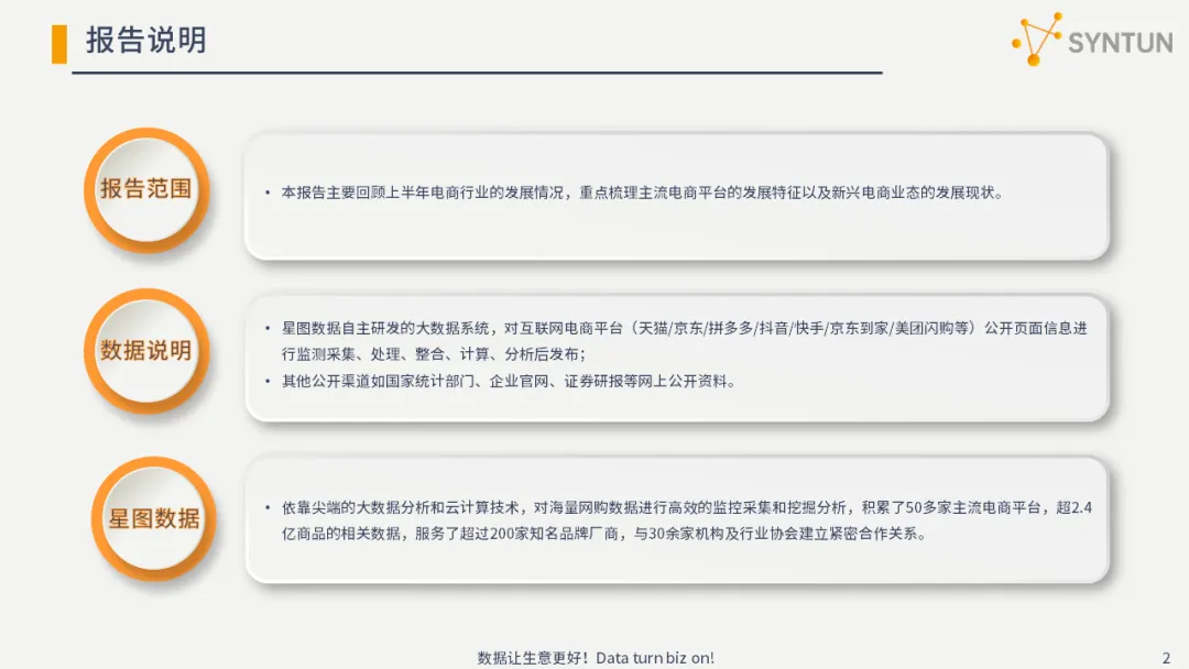 报告范围:本报告主要回顾上半年电商行业的发展情况,重点梳理主流电商平台的发展特征以及新兴电商业态的发展现状。