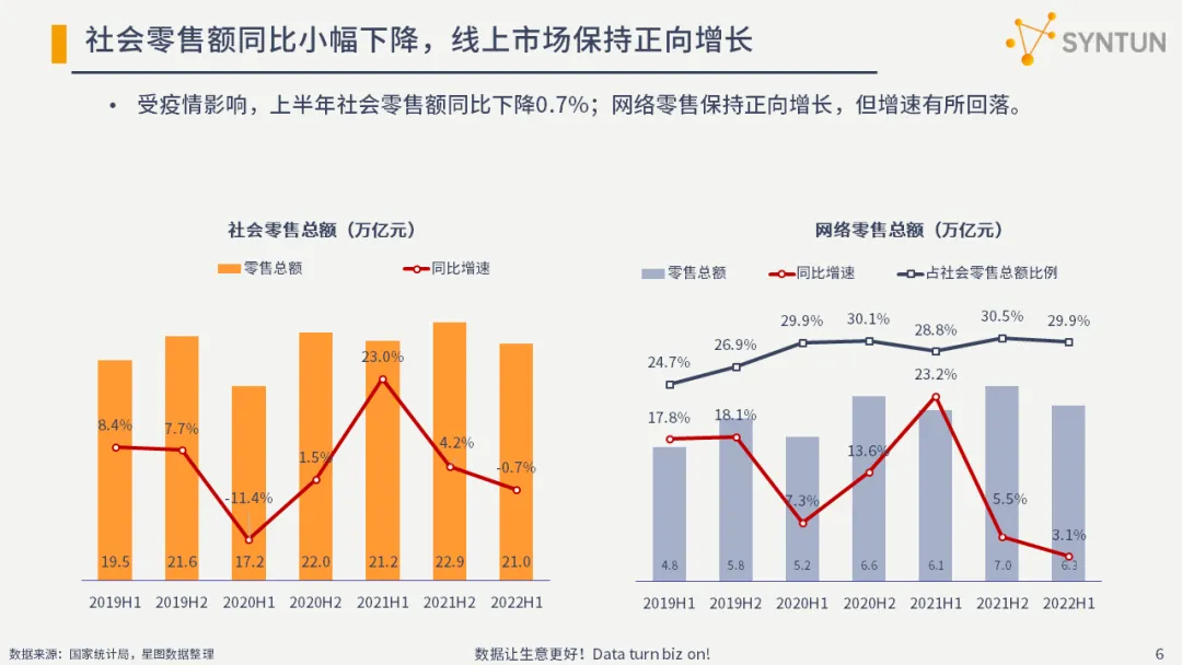 宏观市场环境:上半年消费市场受疫情影响冲击较大,青年人失业率创新高,居民消费意愿相对低迷;防疫相关且不便线下购买的药品类以及生活必需的粮油食品线上同比增速较快。