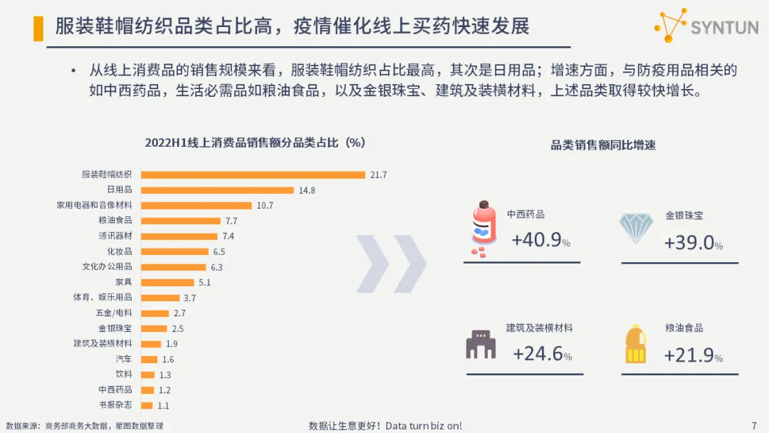 服装鞋帽纺织品类占比高,疫情催化线上买药快速发展