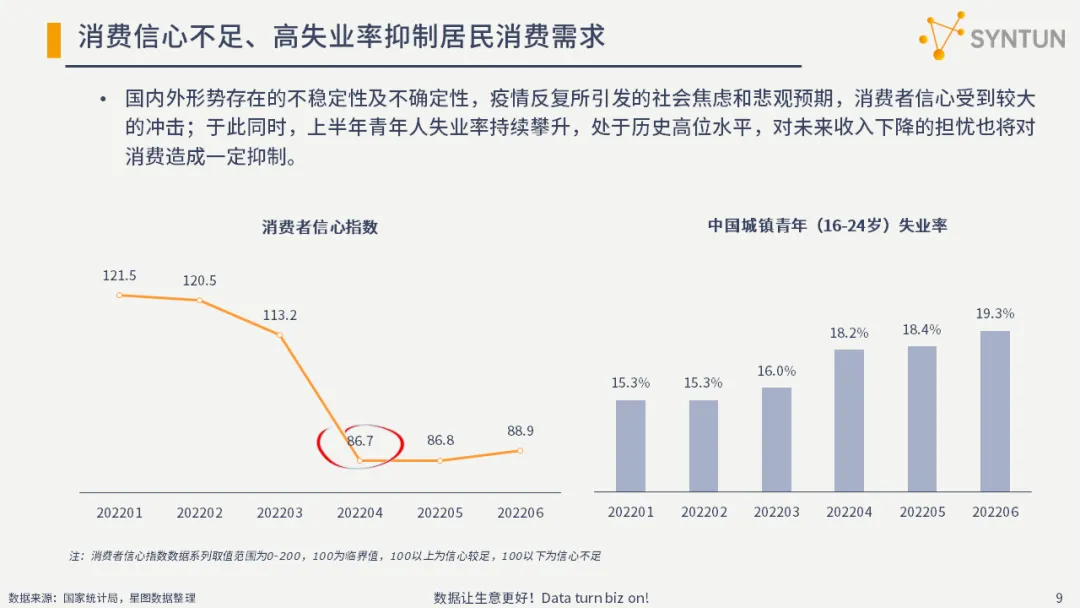 国内外形势存在的不稳定性及不确定性,疫情反复所引发的社会焦虑和悲观预期,消费者信心受到较大的冲击;于此同时,上半年青年人失业率持续攀升,处于历史高位水平,对未来收入下降的担忧也将对消费造成一定抑制。