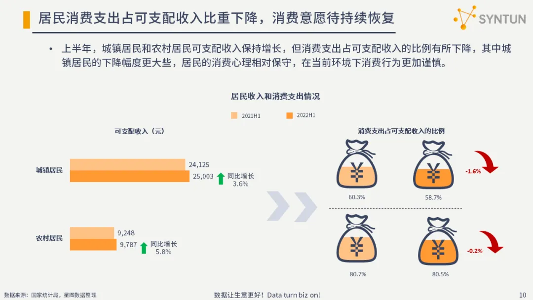 上半年,城镇居民和农村居民可支配收入保持增长,但消费支出占可支配收入的比例有所下降,其中城镇居民的下降幅度更大些,居民的消费心理相对保守,在当前环境下消费行为更加谨慎。
