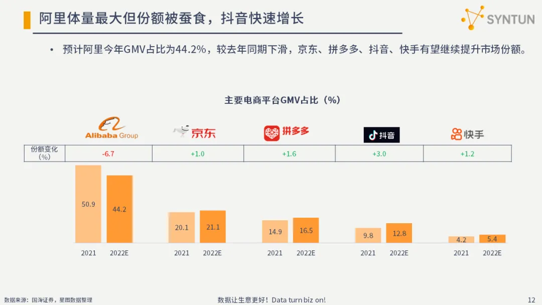 预计阿里今年GMV占比为44.2%,较去年同期下滑,京东、拼多多、抖音、快手有望继续提升市场份额。