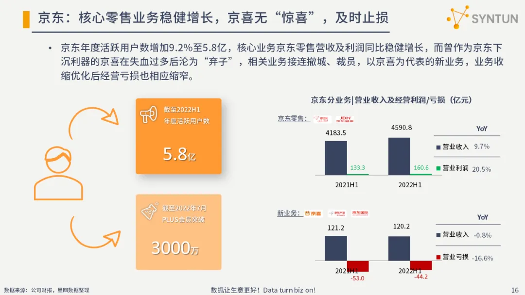 京东年度活跃用户数增加9.2%至5.8亿,核心业务京东零售营收及利润同比稳健增长,而曾作为京东下沉利器的京喜在失血过多后沦为“弃子”,相关业务接连撤城、裁员,以京喜为代表的新业务,业务收缩优化后经营亏损也相应缩窄。