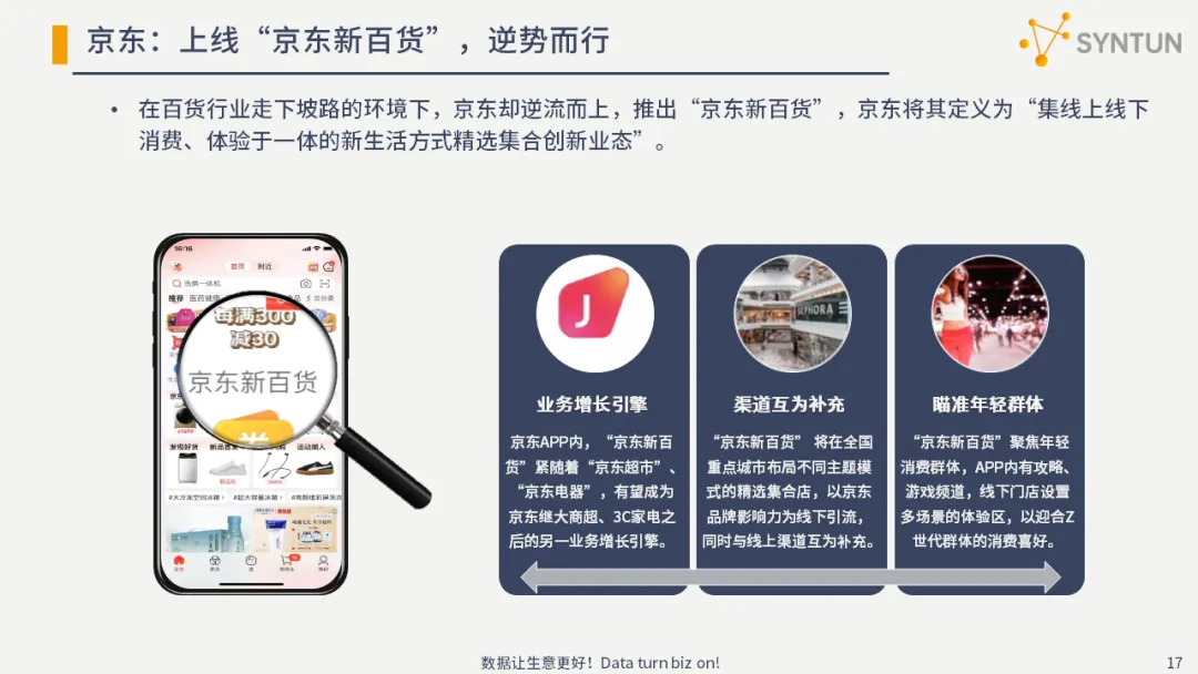 在百货行业走下坡路的环境下,京东却逆流而上,推出“京东新百货”,京东将其定义为“集线上线下消费、体验于一体的新生活方式精选集合创新业态”。