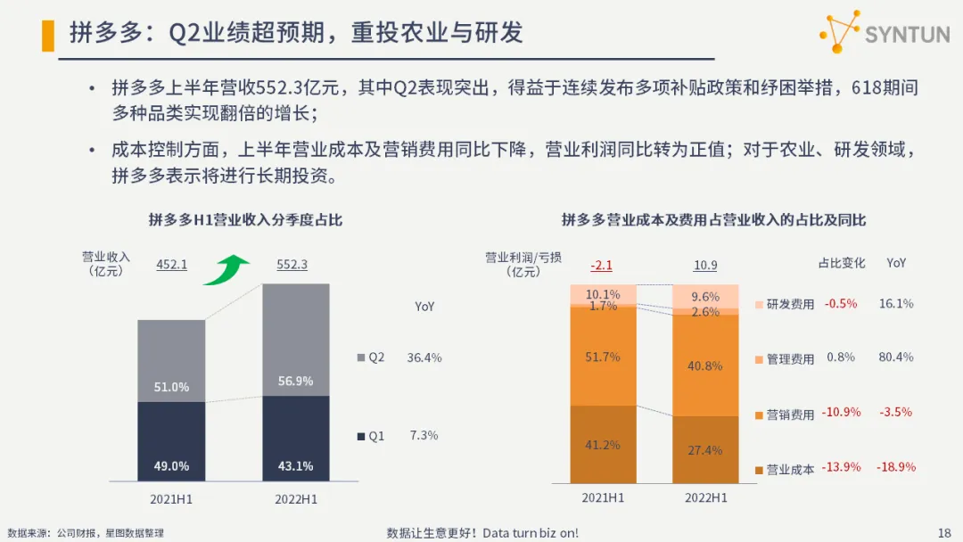 拼多多上半年营收552.3亿元,其中Q2表现突出,得益于连续发布多项补贴政策和纾困举措,618期间多种品类实现翻倍的增长;