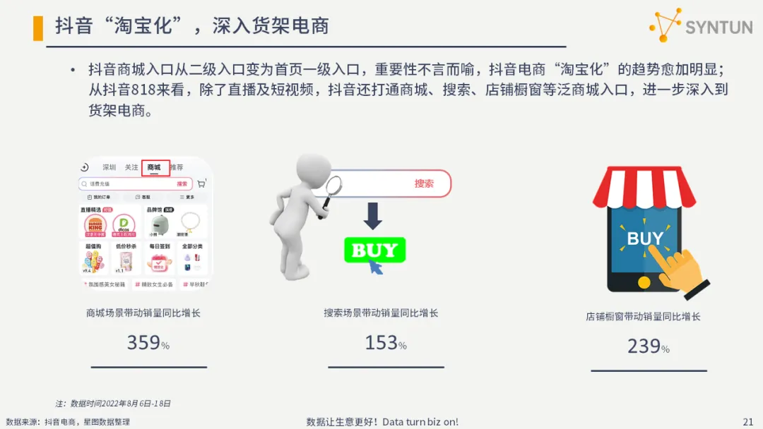 抖音商城入口从二级入口变为首页一级入口,重要性不言而喻,抖音电商“淘宝化”的趋势愈加明显;从抖音818来看,除了直播及短视频,抖音还打通商城、搜索、店铺橱窗等泛商城入口,进一步深入到货架电商。