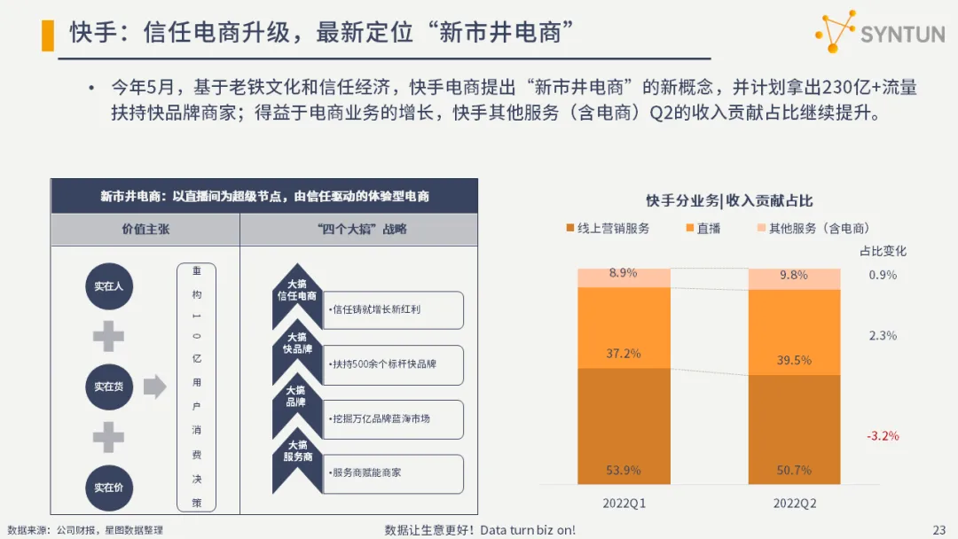 今年5月,基于老铁文化和信任经济,快手电商提出“新市井电商”的新概念,并计划拿出230亿+流量扶持快品牌商家;得益于电商业务的增长,快手其他服务(含电商)Q2的收入贡献占比继续提升。