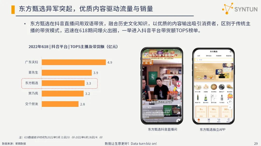 东方甄选在抖音直播间用双语带货,融合历史文化知识,以优质的内容输出吸引消费者,区别于传统主播的带货模式,迅速在618期间爆火出圈,一举进入抖音平台带货额TOP5榜单。