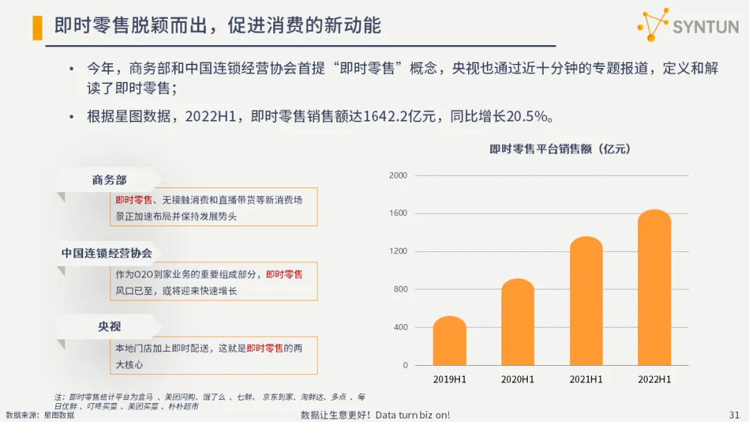 根据星图数据,2022H1,即时零售销售额达1642.2亿元,同比增长20.5%。