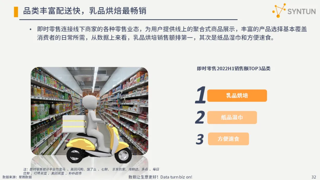 即时零售连接线下商家的各种零售业态,为用户提供线上的聚合式商品展示,丰富的产品选择基本覆盖消费者的日常所需,从数据上来看,乳品烘培销售额排第一,其次是纸品湿巾和方便速食。