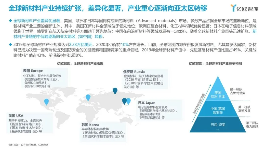,美国、欧洲和日本等国拥有成熟的新材料(Advanced materials)市场,多数产品占据全球市场的垄断地位,是 新材料产业主要的创新主体。其中,美国在新材料全领域位于领先地位;欧洲在复合材料、化工材料领域优势显著;日本在电子信息材料领域