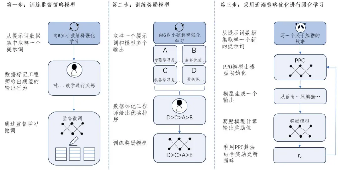 1)训练监督策略模型:使用监督学习或无监督学习的方法,对一个预训练的语言模型进行训练,通过给予特定奖励或惩罚引导 AI 模型的行为,使其能够根据给定的输入预测输出或行为。