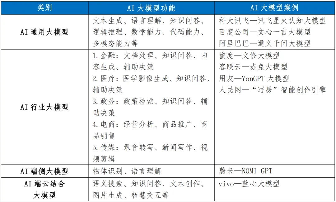 我国具有代表性的通用 AI 大模型主要包含科大讯飞的讯飞星火认知大模型、百度公司的文心一言大模型、阿里巴巴的通义千问大模型等;行业AI 大模型主要涵盖蜜度的文修大模型、容联云的赤兔大模型、用友的 YonGPT 大模型;同时具有云侧和端侧大模型的端云结合 AI 大模型主要有 vivo 的蓝心大模型;端侧 AI 大模型主要以蔚来的 NOMI GPT 大模型为代表。