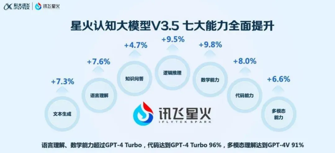 2024 年 1 月,讯飞星火认知大模型 V3.5 发布,七大核心能力全面提升。据科大讯飞宣称,数学、语言理解超 GPT-4 Turbo,在代码能力方面已经达到 GPT-4Turbo 的 96%。另外,星火大模型在多模态理解方面达到 GPT-4V 的 91%,其中语音的多模态能力已经超过 GPT-4。