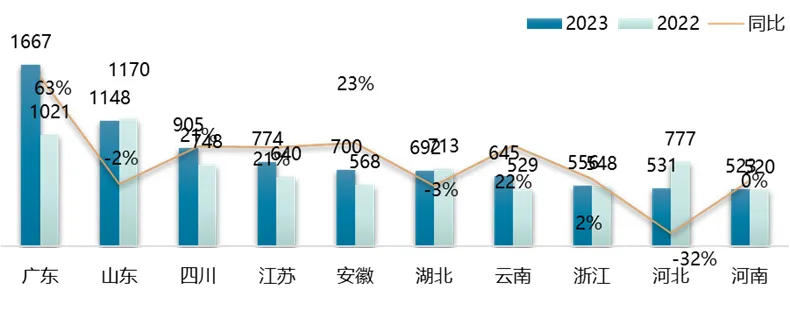 根据数据可以清楚的看到,大量的项目都在广东、山东、四川、江苏、安徽这五个省,是全国前5强。