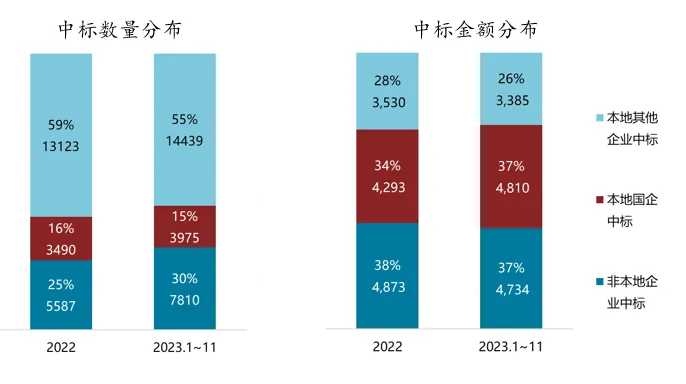 本地其他企业中标数量14439,占比55%;但中标金额很小,3385亿,占比26%。