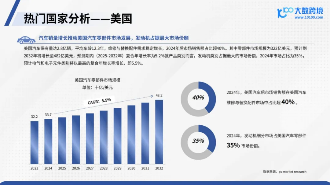 《2025汽配品类出海研究报告》通过区域分析、行业拆解和案例复盘,为企业提供差异化出海参考。核心区域份额高度集中:2023年亚太(28.8%)、北美(23.4%)、欧洲(21%)合计超7成。亚太:2023年售后市场1290亿美元,2030年预计1855亿美元(CAGR5.3%),轮胎占最大比重(2024年22.47%)。印度是增长明星,2035年市场1377.4亿美元(CAGR5.754%)。北美:2023年售后市场1048亿美元,美国占76%,2032年零部件市场达482亿美元(CAGR5.2%),发动机配件需求最高(2024年35%)。欧洲:2023年市场942亿美元,2030年1102亿美元(CAGR2.3%),德国占30%,B2C占64%,2023年汽摩配电商规模816亿美元。新兴市场值得关注:中东偏好豪车改装件与耐高温配件,拉美需求集中于基础维修件,非洲市场以价格敏感型配件和二手件为主。增长驱动力明显:全球汽车销量2024年达7800万辆,2025-2026年继续增长;电动化带动电池、电驱新品类爆发,2025年电动汽车占全球轻型车23.1%,纯电乘用车16.7%。挑战依旧存在:2024年全球汽车零部件百强供应商中,日本22家、美国18家、德国17家、中国15家;头部品牌壁垒高(如博世2024年营收558.9亿美元),国内企业易陷价格战。同时物流成本、技术壁垒和专利合规风险仍是出海阻碍。未来趋势清晰:一是宠物汽配,2025年宠物汽车座椅32.4亿美元,2035年51.3亿美元(CAGR4.7%);二是智能化,智能后视镜、语音导航需求上升;三是个性化,90后/Z世代推动车身改色膜、车载露营设备等热门品类。扬腾创新通过跨境电商实现10年营收翻12倍,从3.6亿元(2021年)到43.4亿元(2025年预计)。渠道+品牌双驱动:亚马逊为核心(占69%,2025年30.1亿元),独立站补充(6.1亿元),品牌覆盖15万个SKU;全球履约+数字化:在全球8国布局仓储,开发销售预测与仓储管理系统,提升配送效率;独立站访问量72.8万次,35-44岁男性为主(23.8%);资本助力扩张:获得腾讯、顺为资本投资,为市场拓展和潜在IPO提供支撑。区域差异决定“因地制宜”,行业趋势指明“创新突破”,标杆案例提供落地路径。中国汽配企业唯有精准定位区域需求、紧跟技术趋势、夯实品牌和供应链,才能从全球市场参与者转向引领者。……