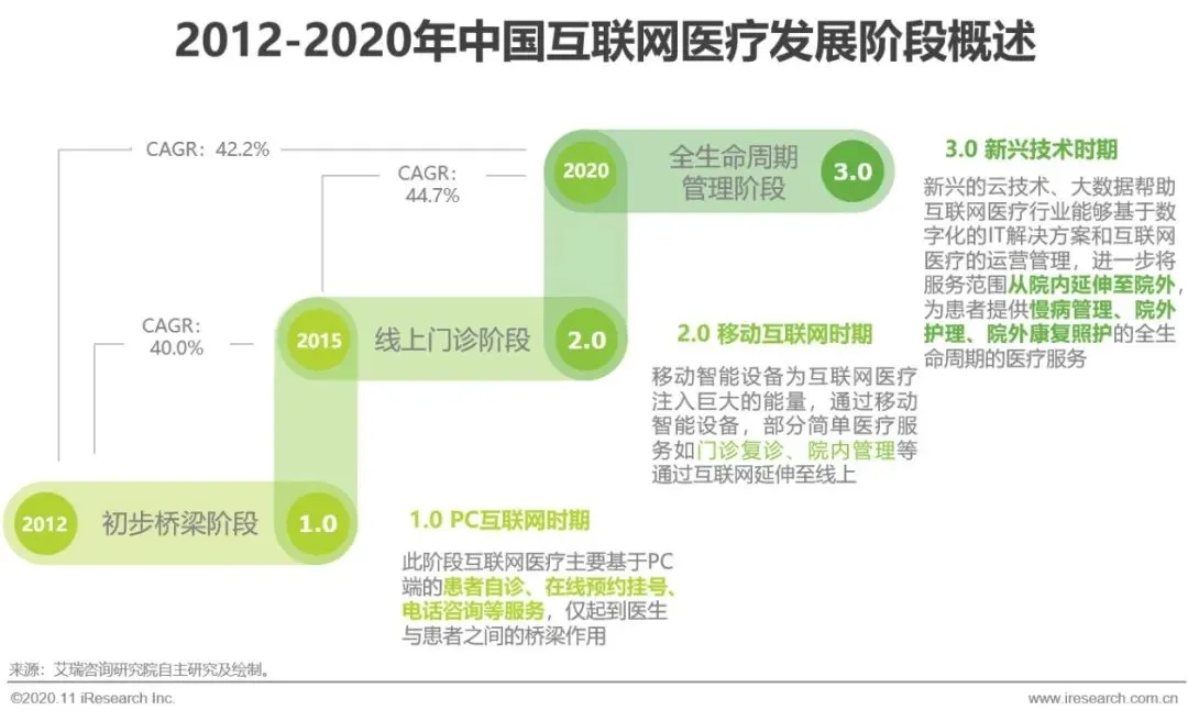 自互联网技术不断进步以来,远程医疗逐渐互联网化,互联网医疗不断取得新的进展。2012年以来,在新医改的冲击下,医院与互联网医疗公司合作,大力开展信息化工作,不断优化看病流程,基于PC端开展在线预约、挂号、咨询等服务。2015年以来,随着移动互联网的普及,移动智能设备使简单的医疗服务如线上问诊等成为可能,但整体仍是以诊断治疗为中心。直至近一年来,互联网医疗开始将目光投向全生命周期的健康管理,通过协调平台与医生团队,将服务范围从单纯医疗延伸至全健康流程,提供慢病管理、院外护理、院外康复照护等,构建真正以居民健康为中心的服务闭环。