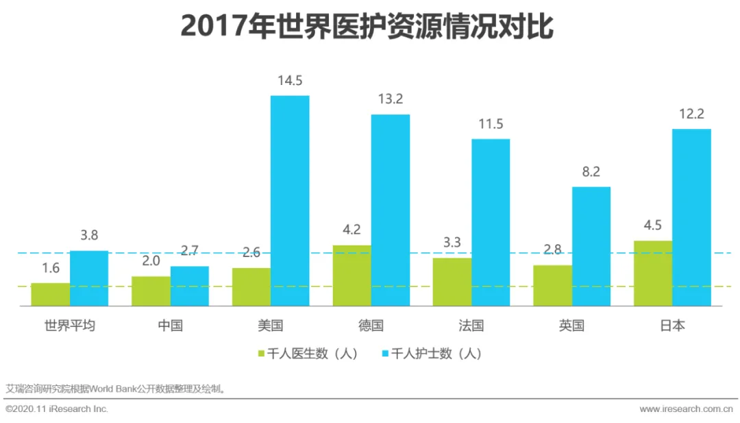 在政府大力推动下,我国医疗技术及医护资源逐年攀升。据艾瑞推算,至2019年千人医生数已达到2.4人,千人护士数已达到3.2人,虽然我国千人医生数已超过世界平均水平。然而中国整体医护资源相比其他发达国家仍有不小的差距,护士资源尤为紧缺。世界上大多数国家护士占总人口约5‰,而目前我国护士仅占总人口3‰左右。艾瑞认为,如果能在诊后院内阶段优化信息系统流程,并在诊后院外阶段通过互联网医疗平台增加医患交流的机会,将会有效提升医生护士的工作效率,并且互联网赋能医疗诊后也会促进医联体的建设,二者共同作用,将会使我国目前的医护资源得到最大化的利用。