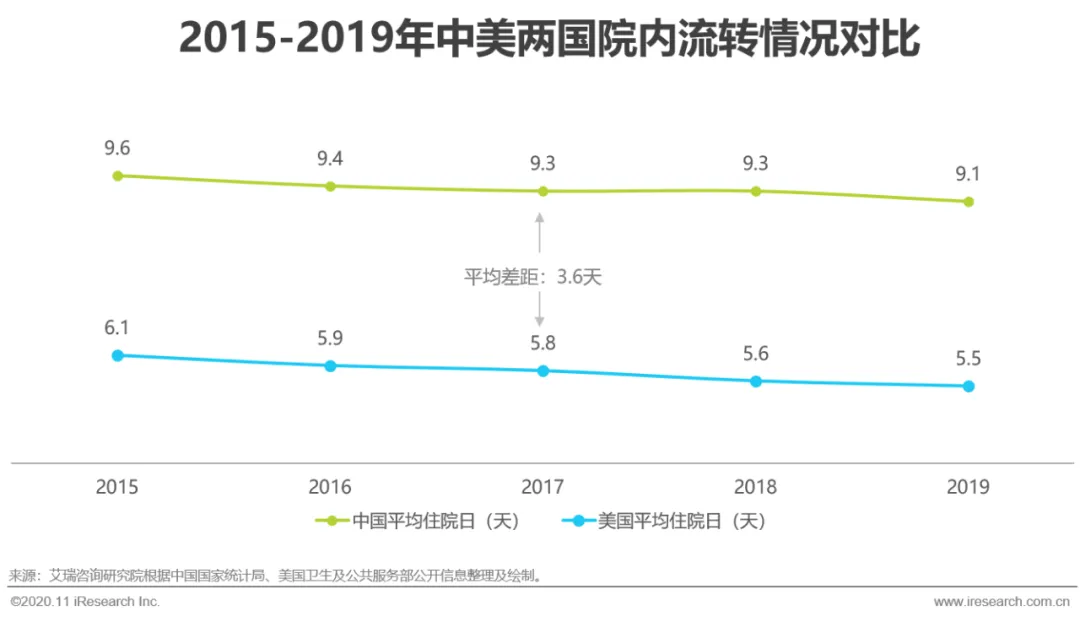 在我国医护资源紧张的背景下,充分利用医疗资源,以最短时间、最佳质量、最少耗费,达到最优疗效成为我国医疗事业发展的方向。2015年至2019年以来,我国平均住院日不断下降,病床流转率增加。但仍要看到相比发达国家,中国医疗效率仍显不够。根据艾瑞估算,美国在近20年来医院总数减少约23%,病床数减少约39%,但平均住院日仍在不断下,相比而言中国在近20年来医院总数增加约86%,病床数增加约165%,因而目前美国医疗效率远高于中国。艾瑞认为,通过互联网医疗诊后的介入,将可使部分患者在院外进行疾病管理,进一步降低平均住院日并可有效提高医疗效率。
